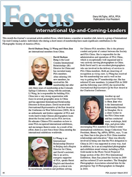 本站导读:聚焦引领未来的核心人物PSA会刊本月专栏人物——邓大端、王莉、沈健 时间:2012年3月9日 来源:本站原创 美国摄影学会(PSA)中国区首席国际代表、美国摄影学会(中国)(PSA China)主席邓大端先生,美国摄影学会(PSA)国际代表、中国区地区主任王莉女士和美国摄影学会(PSA)国际代表沈健先生成为2012年PSA 3月会刊《聚焦》专栏的焦点(作者:会刊副总编 Elena Mctighe,Apsa,PPSA )。专栏对他们在中国所做的工作给以了充分肯定。 邓大端先生在短短的三年里,成功地介绍了106位摄影爱好者加入美国摄影学会(PSA)。在科罗拉多斯普林斯年会上邓大端先生晋升为5星级会员。他在中国建立了多个摄影基地,在2009年的西部黄石PSA年会上,荣获了2009年年度国际代表奖。他一直充满热情、不知疲倦地努力帮助中国摄影人了解和熟悉美国摄影学会。他培训教育中国会员怎样参加PSA认证的国际摄影大赛,并鼓励他们积极参与。在他的努力推动下,中国正在成为世界各地国际摄影赛事的新生力量。 王莉女士是一位积极向上、精力充沛的美国摄影学会(PSA)的支持者。讲着一口流利英语的王莉女士,在中国会员保持、发展和解决会员问题方面起着关键的作用。她负责美国摄影学会(中国)的管理和运营,她谙熟组织并积极地服务于摄影人。邓大端先生和王莉女士也都是专心致志为中国会员服务的优秀摄影师,他们是正在冉冉升起的新星。王莉女士于2009年加入美国摄影学会(PSA),在2010年查尔斯顿年会上就荣获了本年度国际代表奖。 另一位鹊起的人物是沈健先生。他默默地工作在美国摄影学会(中国)的团队中,组织了许多次专题讨论会、外出采风和演讲,鼓励中国会员积极参加国际摄影大赛。美国摄影学会照片收集部副主席——吴振亨先生(APSA, EPSA)说:“我认为沈健先生是美国摄影学会(中国)(PSA China)会员关系和会员培训的粘合剂。”2011年,沈健先生专门接待了美国摄影学会到中国采风的代表团,并提供了全面的支持。除此之外,沈健先生是一位成功的摄影师,在国际赛事中赢得了若干奖项,包括在2011年美国摄影学会(PSA)国际摄影大赛的旅游摄影组中荣获的PSA金奖。 PSA三月会刊原文 PSA三月会刊原文内容如下: PSA Journal:Focus International Leaders This month the Journal’s occasional article entitled Focus, which features a member or member club, turns to a group of International Up-And-Coming-Leaders: individuals who during a short tenure of membership have made significant contributions to the Photographic Society of America (PSA). David Daduan Deng, Li Wang and Shen Jian are international members from China.