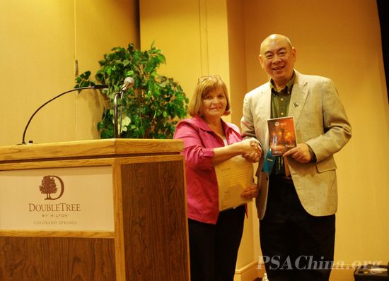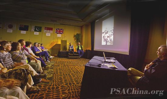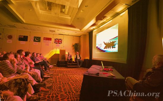PSA周年大会再吹“中国风”《风从中国来II》再获成功 时间:2011年09月24日 来源:本站原创 2011年9月23日,美国摄影学会(中国)的(PSA China)《风从中国来 第二集》(Wind from China II)在美国摄影学会第73届年会上进行了专题演示,并获得了圆满成功!大会主席团的许多成员和来自世界各国的与会代表齐聚演示大厅,欣赏来自中国的故事。演示结束后,PSA China主席、PSA中国区首席代表邓大端先生将《风从中国来 第二集》交给了周年大会执行主席 Janet Bigalke 女士。 由美国摄影学会(中国)精心制作的《风从中国来 第二集》(Wind from China II)分为两大部分:第一部分是PSA在中国,主要展示的是PSA中国会员在中国大陆各地的采风活动、沙龙摄影比赛等;第二部分展示的是福建霞浦、浙江杭州、广东吴川和广西阳朔四个美国摄影学会(中国)摄影创作基地的风光和风土人情,片中所选用的作品都是PSA中国会员在这四个摄影创作基地拍摄的图片,这些图片都进行了严格的挑选,其中不乏在国际影展中多次入选的优秀作品。《风从中国来 第二集》除了展示图片之外,还详细介绍了这些摄影创作基地的背景故事,并配成英文解说,这些深受与会代表的欢迎和好评。 《风从中国来》是由美国摄影学会(中国)在2010年为美国摄影学会年会制作的专题,去年将7位中国会员的作品推介到了美国。今年《风从中国来》不仅仅是吹向美国,她也成为PSA China的一个品牌,将中国会员在近两年来近百个国际影展中获得入围以上奖的作品在中国上海和贵州原生态国际影展中展出。《风从中国来》将成为PSA China展示会员优秀作品和将中国会员及摄影资源推介给世界的品牌。 《风从中国来》演示现场 《风从中国来》演示现场