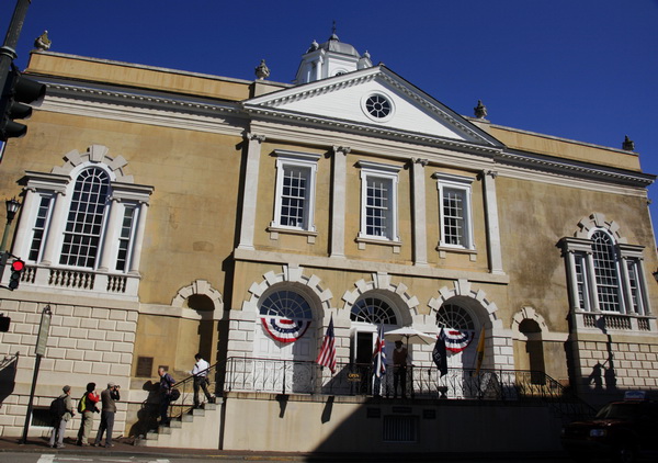 《风从中国来》代表团继续年会旅程时间:2010年10月08日 来源:本站原创 美国时间2010年10月07日,大会安排了非常精彩实用的讲座活动,中国代表团成员都很珍惜这难能可贵的学习机会,于上午集体参加了数码和人像摄影讲座,并对室内人像摄影进行了实际操作,收获颇丰。 室内人像拍摄实习 下午,代表团成员进入到查尔斯顿市区进行采风创作活动。 美国第一家股票交易所 为确保10月08日的《风从中国来》专题活动顺利进行,晚上,代表团成员邓大端先生、于蔚先生与美国摄影学会副会长吴振亨先生进行了详细的商讨,从进入时间、资料发放、播放设备等均涉及到。代表团人员也进行了分工,大家都在为明日的活动忙碌着。 此外,10月8日还有两项活动,一是将公布PSA团体俱乐部比赛成绩,代表团成员朱新生先生所领导的中国通信摄影协会参加了本年度团体俱乐部的比赛;二是将对本年度荣膺国际摄影展金奖的成员颁奖,中国会员吴宗其先生将在明天的活动中领奖,他参赛的作品“亲吻”获得美国摄影学会本年度国际摄影奖金奖。 非常感谢吴振亨副会长对我们代表团的大力支持。 (文字、图片提供人:于蔚、王家伟。)