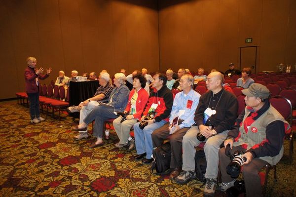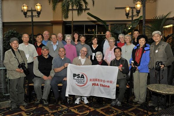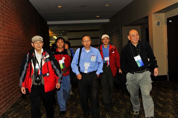 《风从中国来》代表团在PSA年会上--PSA第72届年会系列报道之十四 时间:2010年10月07日 来源:本站原创 10月6日上午8点(美国时间),美国摄影学会副会长吴振亨先生特意打来电话,让我们上午就到会场。大家立即动身,9点左右到达会场,吴振亨副会长热情接待了我们。并陪同我们进行注册、一一介绍年会相关人员、参观大会专门制作的摄影展。 吴振亨副会长(右三)和中国代表团步入会场 大家又都遇见了很多熟识的面孔——2009年来华采风团的部分元老人员,大家相互问候致意,大家和PSA年会主席团在一起合影留念。 前排坐左起邓大端先生、常务副会长约翰•戴维斯先生、会长弗莱德•格林先生、吴宗其先生 12点50分--13点50分,代表团参加了大会组织的新会员会议。PSA副会长乔·斯图尔特女士,为大家介绍了PSA办公地点、组织机构、各活动小组负责人、网站等。 晚上20点--21点30分,大会组织的《非洲20年》图片赏析交流会,邓大端先生带部分中国会员前往参加。 新会员会议现场 吴振亨副会长带大家参观年会摄影展