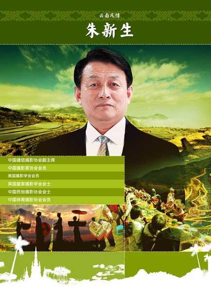 《风从中国来》摄影家介绍之朱新生先生--PSA第72届年会系列报道之十五 时间:2010年10月08日 来源:本站原创 朱新生:《云南风情》 朱新生先生现为美国摄影学会会员、中国通信摄影协会副主席、中国摄影家协会会员、英国皇家摄影学会会士、中国民俗摄影协会会士和中国体育摄影协会会员。 作为一名著名摄影家,朱新生先生对他所钟爱的摄影事业坚持了40年并且取得了骄人的成绩和丰硕的成果。他曾获北京市摄影比赛二等奖,全国摄影比赛三等奖,作品多次入选国际摄影展,2005年经严格考核,获得了国际著名摄影机构——英国皇家摄影学会会士衔。2009年加入美国摄影学会,从此,真正步入了摄影家的行列。近年来,他深入新疆、西藏、川西以及尼泊尔等地,创作了大量风光人文作品。 他创作的云南风情系列摄影作品,作品以气势和内涵见长,尤其擅长抓拍。充分地体现了他高超的摄影技术和广阔的艺术见解,将云南独特的自然风光和人文景观以艺术家的视角充分浓缩到自己的影像中。这一系列作品,大气磅礴,气势恢宏,在令人望之陶醉的大背景下又同时把握生命活的细节,将人与自然的大主题生动地表现在一幅幅摄影作品里。