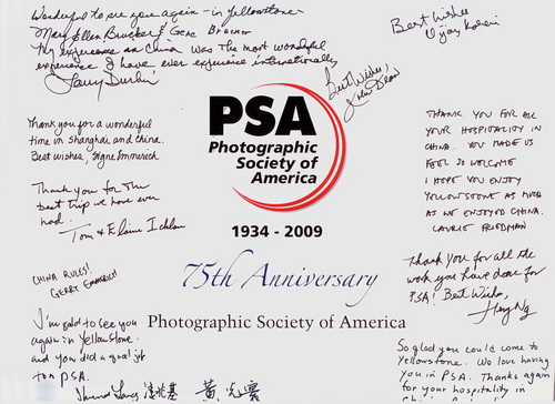 在PSA75周年国际摄影年会期间,曾经到过中国采风的PSA元老会员们为了表达谢意,特别邀请邓大端先生和王莉女士共进晚餐。国人看似平常的聚会邀请,在国外,尤其是美国确是非同寻常的一件事。众所周知,美国是一个非常强调个人自由的国家,大型聚会如果没有事先约定是很难成功的,但这次聚会却是由参加中国采风的PSA会员们在极短的时间内自发组织起来的,可以说对于拥有完全不同文化背景的美国人而言,这简直就是破天荒的事情。到过中国的18位PSA会员中只有一人缺席,原因是当天早上5点多这名会员就起程到黄石公园进行拍摄活动了,晚上回到驻地听说自己错过了答谢晚宴,懊悔不已,事后又特别找到王莉女士在画册扉页中补签了留言。