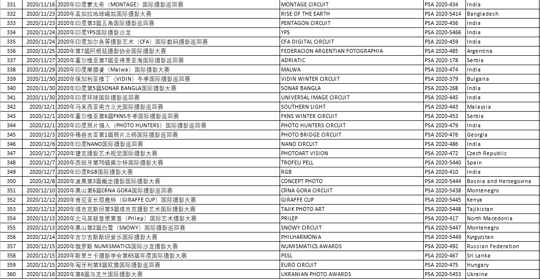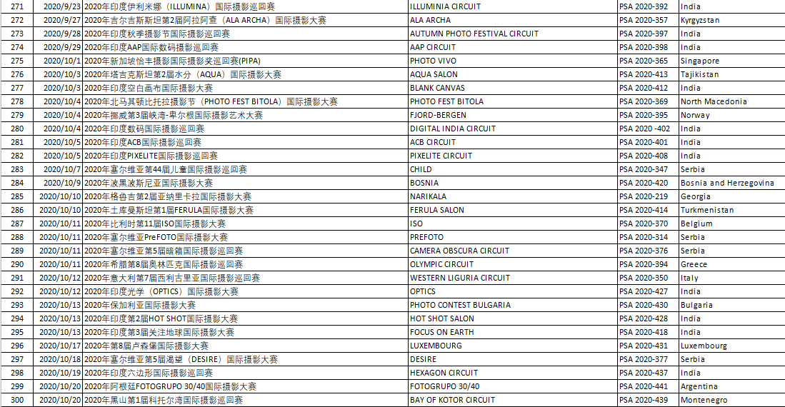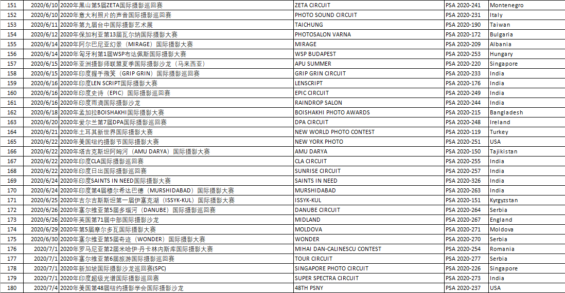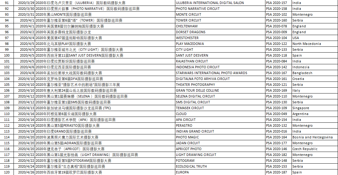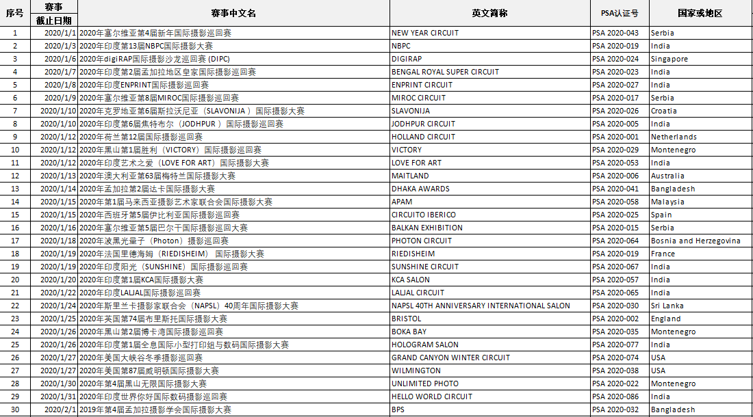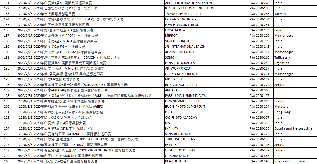 关于2020年度PSA China国际摄影十杰评定的说明尊敬的PSAC会员朋友们: 自2011年1月PSA China首次评选并公布“2010年度PSA China国际摄影十杰”以来, 迄今已进入第10个年度。经过多年的积淀,“PSA China国际摄影十杰”的评定已覆盖绝大部分中国摄影人参与的PSA认证国际摄影赛事,收集整理参赛成绩流程日臻完善,建立了完整的历史数据库,从而保证了其评定结果的公平、公正和权威性。“PSA China国际摄影十杰”已成为中国摄影人的“国际摄影名人录”,日益受到中国乃至世界摄影界的关注和广泛认可。 目前,“2020年度PSA China国际摄影十杰”的数据收集整理工作已经完成,进入数据核验阶段。PSAC年度十杰的评定,是对PSAC会员上一年度国际摄影赛事成绩的回顾和检阅,并由此激励更多的中外摄影人关注并加入PSAC这个共同学习交流成长的大家庭、大学校,积极参与国际摄影大赛,获取更筑摄影艺术之梦,共享艺术创作成果,将继续推动和帮助更多的中国摄影人走向世界! 1.年度十杰评定方法 2020年PSAC十杰评定,以PSAC国际摄影赛事成绩数据库为依据,延续PSAC一贯采用的计分标准,针对入围和获奖作品计算分值并排名,评定方法不变。具体规定参见《PSAC国际摄影十杰评选管理办法》(http://www.psachina.org/contents/455/6861.html)。 2.入选资格 进入“十杰”的必须为PSAC持证会员且具备有效年度会员资格(2020年度会员持证有效期不少于6个月)。 3.计分的赛事范围 为保证收集整理2020年赛事成绩的全面性和时效性,本次评定收录的赛事,赛事截稿日期在2020年1月1日(含)至2020年12月31日(含)之间,PSA认证号为2020年赛事,可计入有效分值的赛事成绩,赛事清单参见《附录二》。 4.十杰公布 PSAC秘书处经成绩整理汇总后,根据会员个人总分,按照总分由高到低的顺序排列名次,确定PSAC会员年度国际摄影影艺分值及排名。 十杰评定结果一经公布,排名顺序即为最终结果。 5.会员成绩补录 十杰评定结果公布后1个月内,PSAC接受会员成绩补录和查询。成绩补录仅作为会员个人成绩档案库的修订更正依据,不影响十杰评定排名顺序。 会员如需进行个人成绩补录和查询,需在规定时间内(2021年4月1日前)依照标准格式(见《附录三》)提交个人成绩汇总,并视秘书处要求提供相关的入围及获奖证明(入围或获奖邮件及其他证明)。PSAC将会依据相关证明做出汇总,向会员提供2020年年度总成绩单。 PSA China秘书处 2020年2月25日 关于2020年度PSA China国际摄影十杰评定的说明附件 附录一 :《PSAC国际摄影十杰评选管理办法》(http://www.psachina.org/contents/455/6861.html) 附录二:“2020年度PSA China国际摄影十杰”评定成绩有效赛事列表 附录三:会员提供汇总成绩模板。 会员提供汇总成绩模板 会员姓名: