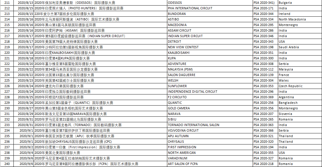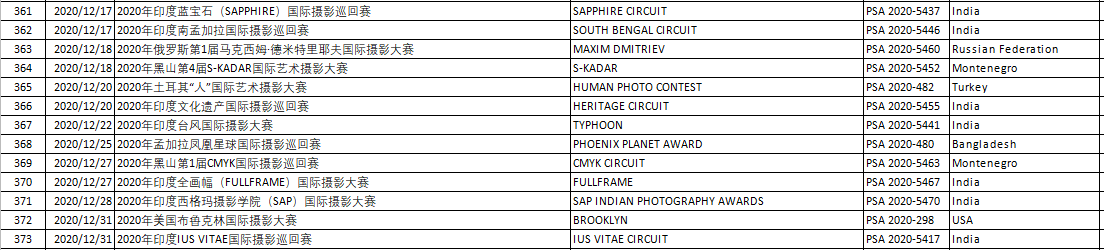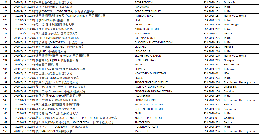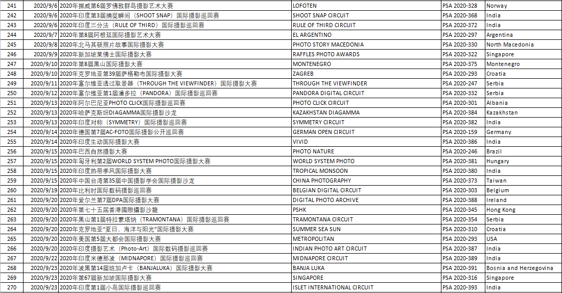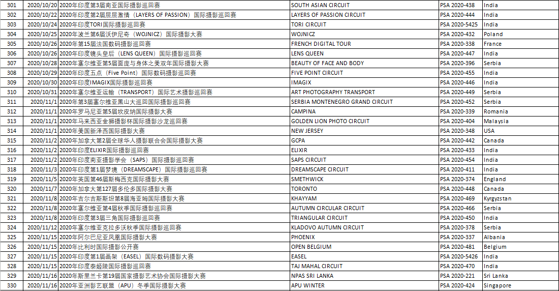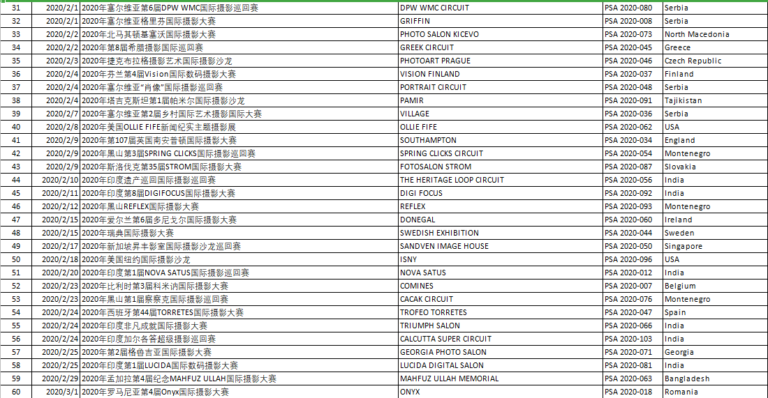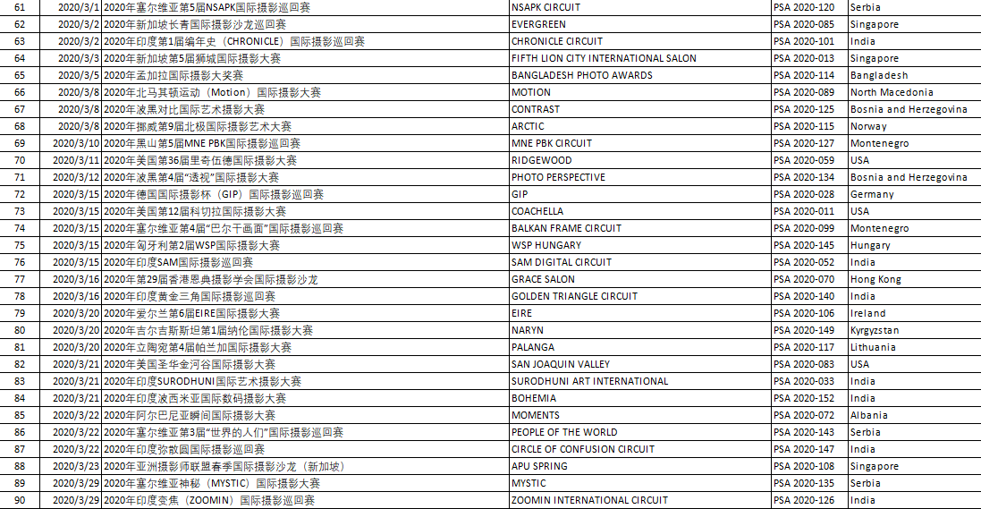 关于2020年度PSA China国际摄影十杰评定的说明尊敬的PSAC会员朋友们: 自2011年1月PSA China首次评选并公布“2010年度PSA China国际摄影十杰”以来, 迄今已进入第10个年度。经过多年的积淀,“PSA China国际摄影十杰”的评定已覆盖绝大部分中国摄影人参与的PSA认证国际摄影赛事,收集整理参赛成绩流程日臻完善,建立了完整的历史数据库,从而保证了其评定结果的公平、公正和权威性。“PSA China国际摄影十杰”已成为中国摄影人的“国际摄影名人录”,日益受到中国乃至世界摄影界的关注和广泛认可。 目前,“2020年度PSA China国际摄影十杰”的数据收集整理工作已经完成,进入数据核验阶段。PSAC年度十杰的评定,是对PSAC会员上一年度国际摄影赛事成绩的回顾和检阅,并由此激励更多的中外摄影人关注并加入PSAC这个共同学习交流成长的大家庭、大学校,积极参与国际摄影大赛,获取更筑摄影艺术之梦,共享艺术创作成果,将继续推动和帮助更多的中国摄影人走向世界! 1.年度十杰评定方法 2020年PSAC十杰评定,以PSAC国际摄影赛事成绩数据库为依据,延续PSAC一贯采用的计分标准,针对入围和获奖作品计算分值并排名,评定方法不变。具体规定参见《PSAC国际摄影十杰评选管理办法》(http://www.psachina.org/contents/455/6861.html)。 2.入选资格 进入“十杰”的必须为PSAC持证会员且具备有效年度会员资格(2020年度会员持证有效期不少于6个月)。 3.计分的赛事范围 为保证收集整理2020年赛事成绩的全面性和时效性,本次评定收录的赛事,赛事截稿日期在2020年1月1日(含)至2020年12月31日(含)之间,PSA认证号为2020年赛事,可计入有效分值的赛事成绩,赛事清单参见《附录二》。 4.十杰公布 PSAC秘书处经成绩整理汇总后,根据会员个人总分,按照总分由高到低的顺序排列名次,确定PSAC会员年度国际摄影影艺分值及排名。 十杰评定结果一经公布,排名顺序即为最终结果。 5.会员成绩补录 十杰评定结果公布后1个月内,PSAC接受会员成绩补录和查询。成绩补录仅作为会员个人成绩档案库的修订更正依据,不影响十杰评定排名顺序。 会员如需进行个人成绩补录和查询,需在规定时间内(2021年4月1日前)依照标准格式(见《附录三》)提交个人成绩汇总,并视秘书处要求提供相关的入围及获奖证明(入围或获奖邮件及其他证明)。PSAC将会依据相关证明做出汇总,向会员提供2020年年度总成绩单。 PSA China秘书处 2020年2月25日 关于2020年度PSA China国际摄影十杰评定的说明附件 附录一 :《PSAC国际摄影十杰评选管理办法》(http://www.psachina.org/contents/455/6861.html) 附录二:“2020年度PSA China国际摄影十杰”评定成绩有效赛事列表 附录三:会员提供汇总成绩模板。 会员提供汇总成绩模板 会员姓名: