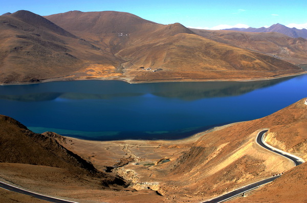 西藏羊卓雍错湖 点评:稍往下一点构图,把路拍全,这种片子重要的就是颜色与质感,这张片子的颜色拍的非常好,路面颜色也拍的非常好。
