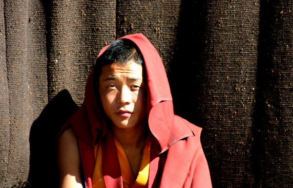 西藏扎什伦布寺的喇嘛 点评:构图再饱满一点,高原地区光比特别大,地面本身还有反光,曝光再压点,衣服的红的颜色会更好