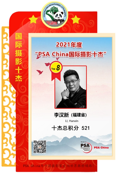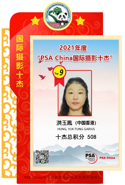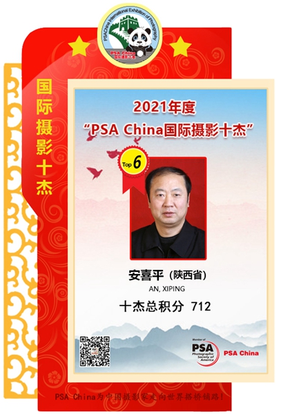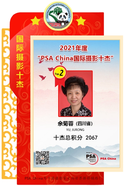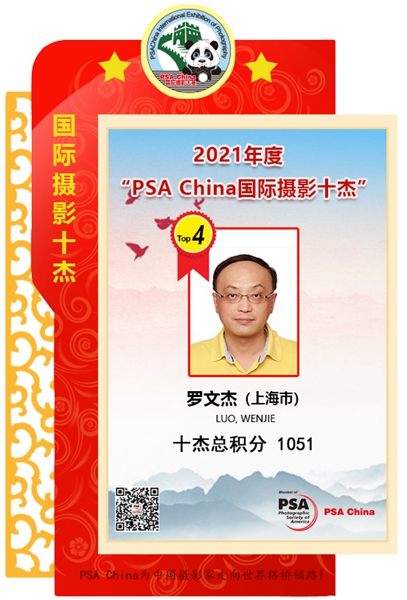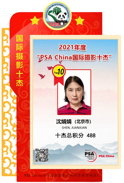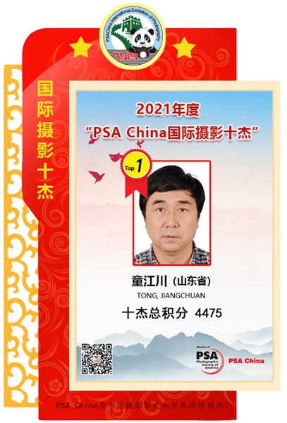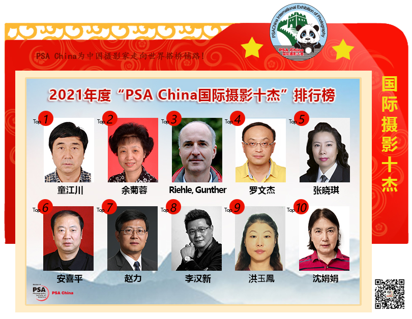 2021年度“PSA China国际摄影十杰”揭晓!自2009年以来,PSA China将PSA认证国际摄影赛事引入中国,并率先组织中国摄影人参加国际认证赛事。为让每一位PSAC会员对自己参加PSA认证国际摄影赛事的成绩有一个完整的认知,特设立了PSA China会员专属成绩记录系统。根据PSA China系统成绩统计整理,每年度都将评选出年度“PSA China国际摄影十杰”,同时此成绩也将记录在PSA China的“星级”与“名衔”系统中。 本次评定收录的赛事,赛事截稿日期在2021年1月1日(含)至2021年12月31日(含)之间,PSA认证号为2021年,可计入有效分值的赛事共390个。点击查看赛事列表 以下是“2021年PSA China国际摄影十杰”:
