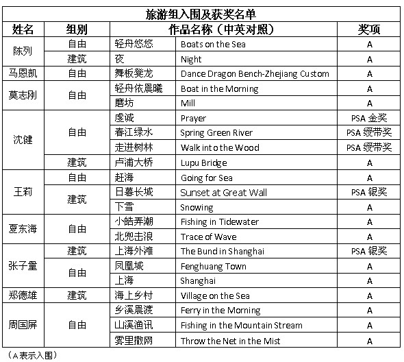 2011 美国摄影学会国际摄影展中国会员旅游组(PTD)再获佳绩时间:2011年8月25日 来源:本站原创 2011 美国摄影学会国际摄影展(2011 PSA International Exhibition of Photography)旅游照片组传出好消息,美国摄影学会(中国)会员斩获一金两银,再获佳绩。美国摄影学会会员沈健先生的《祈祷》(Prayer)荣获旅游自由组PSA金奖,会员张子量先生的《上海外滩》(The Bund in Shanghai)荣获旅游建筑组PSA银奖,会员王莉女士的《日暮长城》(Sunset at Great Wall)荣获旅游建筑组PSA银奖。 此外,沈健先生的《春江绿水》(Spring Green River)和《走进树林》(Walk into the Wood)荣获旅游自由组PSA绶带奖。 本次影展旅游照片组美国摄影学会(中国)共送展11位作者的72幅作品,获得入围以上奖项的作品21幅。 沈健先生2011 美国摄影学会国际摄影展旅游自由组PSA金奖作品《祈祷》 张子量先生2011 美国摄影学会国际摄影展旅游建筑组PSA银奖作品《上海外滩》