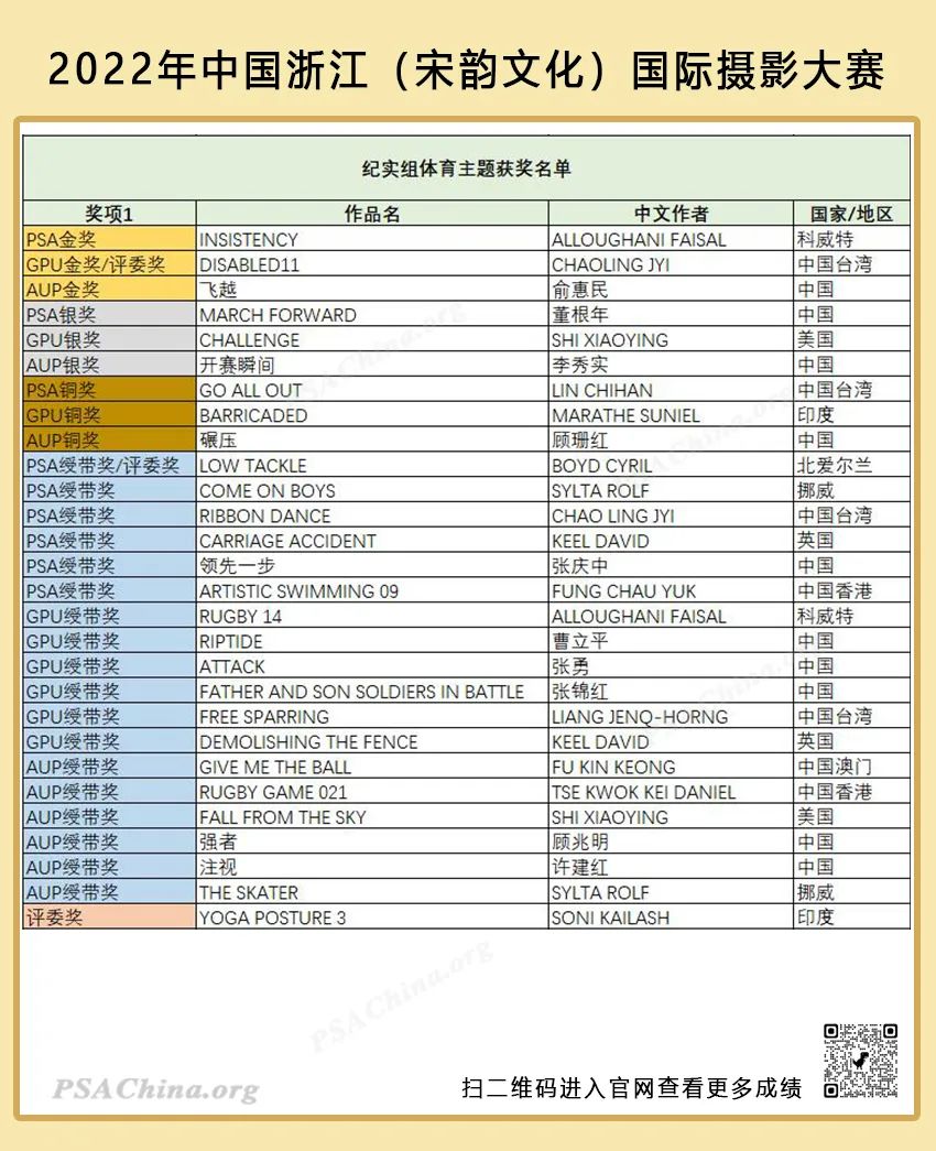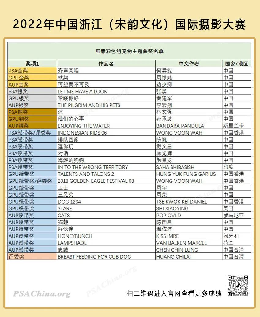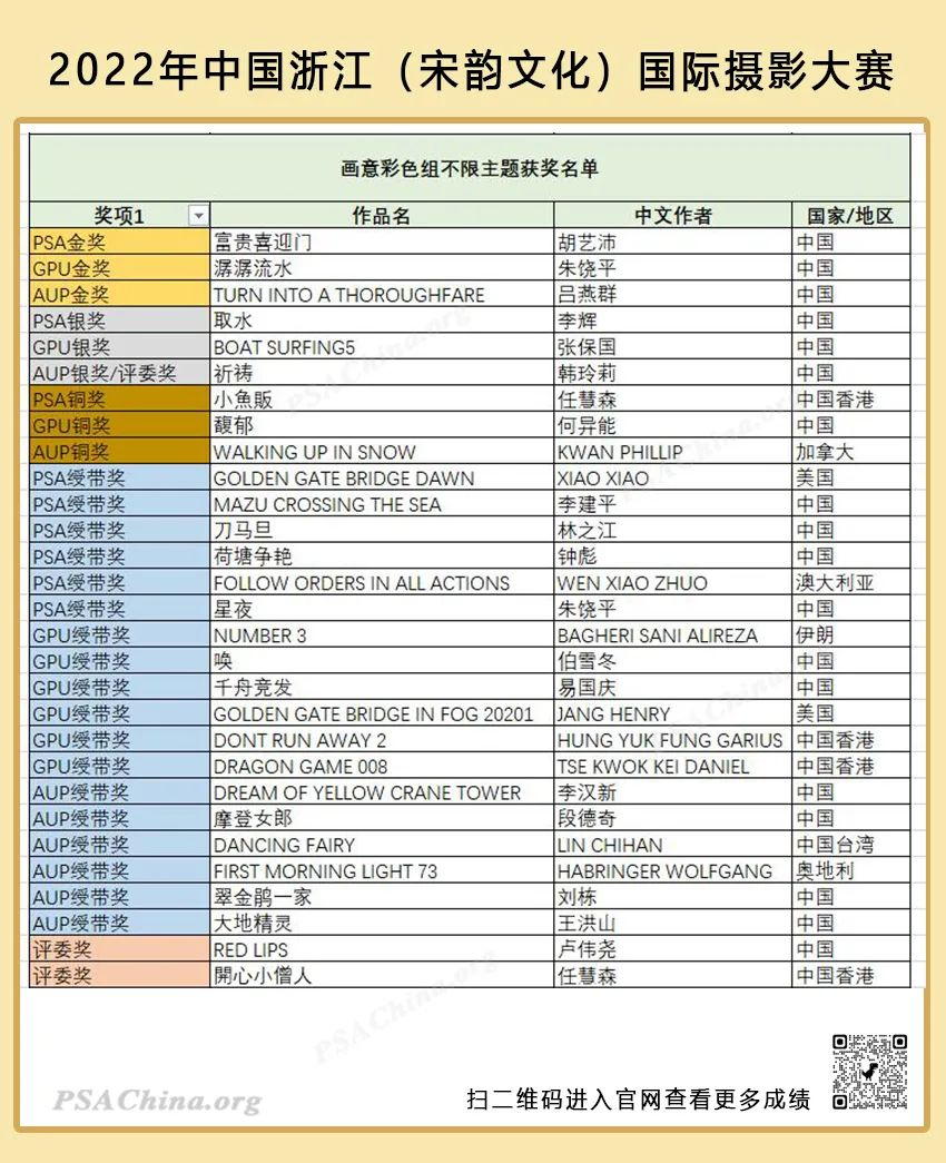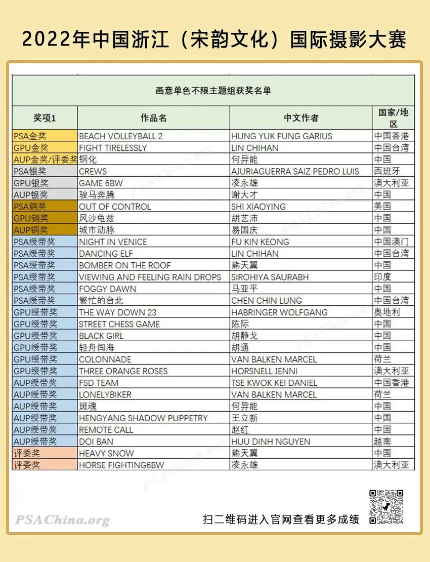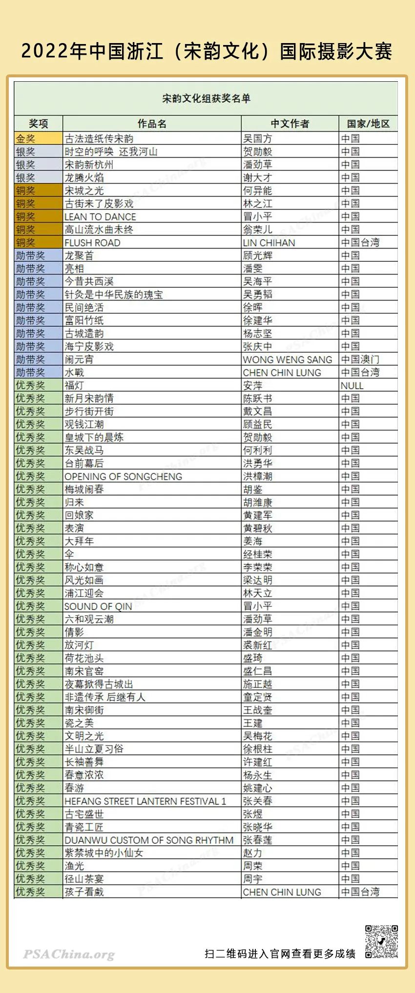 第四届中国浙江(宋韵文化)国际摄影大赛入围、获奖结果揭晓第四届中国浙江(宋韵文化)国际摄影大赛评审工作已经圆满结束。本次大赛面向全球摄影人征集作品,是获得美国摄影学会(PSA),世界摄影师联盟(GPU) 和寰宇摄影家联盟(AUP)认证,所获成绩皆计入世界摄影名衔积分(“宋韵文化”主题组除外)。 所有赛事成绩请登录赛事官网(或点击阅读全文)查看:https://zhejiang.psachina.org
