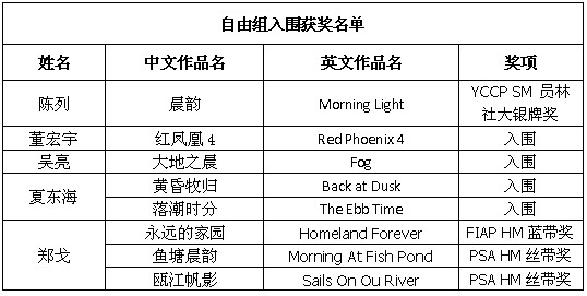 2011台湾员林国际摄影艺术展览(Yuanlin International Exhibition of Photography 2011)获奖成绩近日公布。在本届摄影展中,通过美国摄影学会(中国)送展获得入围以上奖项作品有9幅。其中,美国摄影学会会员陈列先生的作品《晨韵》(Morning Light)荣获自由组YCCP SM 员林社大银牌奖,美国摄影学会会员郑戈先生的作品《永远的家园》(Homeland Forever)荣获自由组FIAP–HM蓝带奖,《鱼塘晨韵》(Morning At Fish Pond)荣获自由组PSA HM丝带奖,《瓯江帆影》(Sails On Ou River)荣获自由组PSA HM丝带奖。