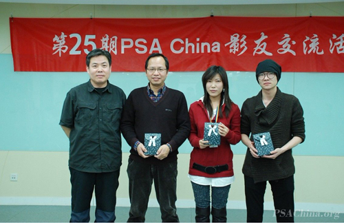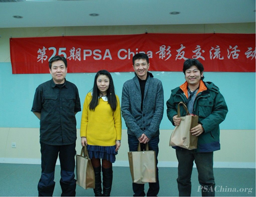 “2011 PSA China国际摄影大赛”获奖作品赏析暨第25期PSA China影友交流活动于2011年12月17日在美国摄影学会(中国)总部——北京泛利大厦如期举行。来自北京的摄影爱好者参加了本次活动。 交流会上,PSA China沙龙摄影网络大赛(第三季)评委、全国十佳摄影记者、广角摄影学会理事、《证券市场周刊》首席摄影记者赵亚鸣先生首先为来宾展示点评了“2011 PSA China国际摄影大赛” 彩色画意组(CPID)和黑白数码照片组(EID)获得优秀以上奖项的70多幅作品,之后对影友带来的作品进行了现场讲评。