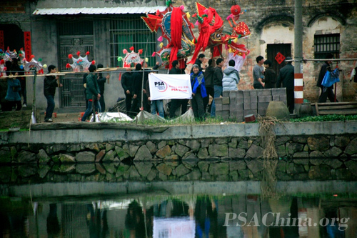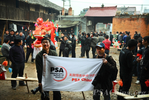 三拍浦江板凳龙 ——上海工作站活动侧记之二十二时间:2012年02月09日 来源:美国摄影学会中国国际代表沈健 供稿 浙江省浦江县的板凳龙以文化部列入首批国家级非物质文化遗产而闻名遐迩。从正月初七开始各个村镇都舞起板凳龙,迎接一年一度的元宵节,一直持续到正月十五。在浦江,一般每户出一人一条板凳,村子越大,龙越长,舞龙的难度也越高,也越具观赏性。各村各镇色彩绚丽的板凳龙走街窜巷,热闹起舞,也祈盼着来年风调雨顺、家家户户快乐吉祥。 有时候邻村的板凳龙过来拜年,两村龙缠绕一起煞是好看。据当地人讲:由于龙与龙之间不能跨越,所以当两条龙缠绕时需要老者领路,才能盘旋而出。有时候最多能有5条龙在一起竞相挥舞,那更是一绝。 我们一行19人,在当地摄影家协会戴瑞阳老师的指引下来到浦江已经第三个年头了。没想到在这里有PSA会员陈进建,在他的一路陪伴下,我们在马墅看到了最美的烟花,在岩头听到了震耳欲聋、长达4小时的烟花爆竹声、在寺前吃到了镇里免费为大家准备的盒饭、在陈进建家品尝当地“茅台”,领民俗风情。 PSAChina大旗再次在浦江拉起。 会员高艳东和陈炳生举起大旗