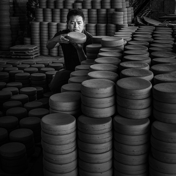 2022年6月26日,在广西荔浦县大塘镇庆华村雷家屯雷氏陶瓷制品有限公司的生产基地采风。据说,该公司的产品质量好,雷老板对产品质量要求很严,经常到产品库检查质量。 说来也巧,上午11点15分,我们来到一个存放陶器产品的工栅时,发现雷老板正在抽检陶器产品的合格率。这个简易的工棚室内很暗,但右边却有光线影入室内。这时雷老板正在瞄看一个陶器平面的平整度,那种认真的神态使我迅速按下了快门。
