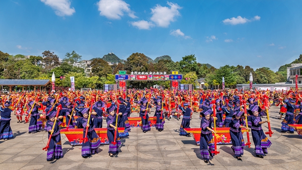 霜降节是壮族人民欢庆丰收的日子,该节日列为世界非物质文化遗产。霜降的这一天,壮族人民会举行盛大的庆典活动,庆祝当年的丰收,祝愿美好的生活,中午时分,壮族的民众跳起了 “打榔舞”尽情的狂欢。“壮族打榔舞” 是广西天等县的一种壮族舞蹈,是从田间劳作演变而成,利用木榔和木杵敲击出特有的节奏,以此表达壮族人民对五谷丰登、幸福吉祥的祈求和渴望。 2022年10月23日是当年的霜降节气,作者采风来到了广西天等县打榔舞广场,拍下了这幅壮美的场景。 11时16分接近正午,光线强,呈现顶光,曝光组合的参数是,采用M档,固定光圈f9、固定快门1/200秒、固定ISO50、焦距24毫米,并设置“強调亮光”参数(即减弱强光)。这张图片抓拍成功,曝光正确,色彩鲜艳、自然,清晰度高。 现场抓拍,采用M档,固定所需的光圈和快门速度,固定 ISO的曝光组合,强光下,将ISO设为小,能拍到画质极高的图片。