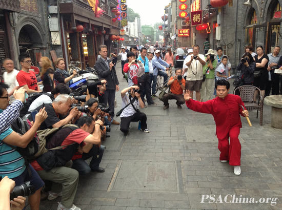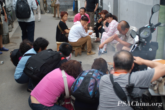 2013·“魅力大栅栏”摄影抓拍赛活动花絮之三时间:2013年05月28日 来源:本站原创 2013年5月26日下午,天空飘着绵绵细雨,近三十位会员和慕名而来的摄影爱好者仍风雨无阻齐聚北京大栅栏,参加“魅力大栅栏”摄影抓拍赛重点拍摄活动。当天,重点组织大家前往前门西河沿街、佘家胡同、延寿街、炭儿胡同等大栅栏街道胡同,重点抓拍地区公共服务实体、实体中涉及科技的元素以及在这些实体中举办的丰富多彩的居民活动。 本次活动是“魅力大栅栏”摄影抓拍赛组织的第三次重点拍摄活动。为赶在大雨骤降前,大家拍摄时格外精神专注,争分夺秒,用慧眼寻找大栅栏街边、胡同中的美。天空的阴霾,丝毫没有影响大家的拍摄热情。 参加活动成员合影 大家抓拍街头的武术表演 前进!我们去寻找胡通中的美 抓拍胡同居民的家庭烧烤,引众影友竞折腰