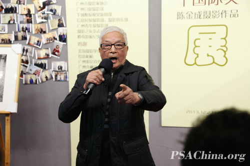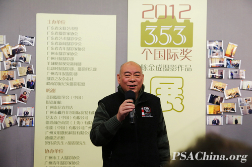 美国摄影学会会员摄影家陈金成在广州隆重举办个人展时间:2013年12月21日 来源:PSA China广州工作站 2013年12月21日,美国摄影学会(PSA)会员、摄影家陈金成先生个人摄影展在广东省文联艺术馆隆重举行。陈金成先生在2012年共获得国内外奖项353个,影展集中展出了其部分精选的摄影获奖佳作。 影展开幕当天,美国摄影学会(PSA)中国广州会员、摄影界同行以及媒体代表等数百余人出席了开幕式,出席嘉宾包括:美国摄影学会(PSA)中国区首席国际代表、美国摄影学会(中国)(PSA China)主席邓大端,广东省摄影家协会副主席陈俊生、广东省摄影家协会副主席郭小玲、广东省摄影家协会副主席谢墨、广东省摄影家协会副罗旭、广东省青年摄影家协会主席姚广滨、《广州日报》摄影部主任张伟清等领导嘉宾参加了开幕。现场气氛热烈而又隆重。 美国摄影学会(PSA)中国区首席国际代表、美国摄影学会(中国)(PSA China)主席邓大端,广东省摄影家协会副主席陈俊生以及广东省摄影家协会副主席谢墨分别讲话,祝贺陈金成近期在国际影展上取得的优异成绩,同时希望并呼吁大家在摄影事业上,能够勇于走出国门,开拓视野,与世界摄影同仁同台竞技,切磋学习,不懈努力,攀登更高的艺术高峰!为中国摄影人争光! 本次活动得到了摄影届同仁、市民和多家媒体的高度关注,吸引了数百余人参加。开幕式后,参会嘉宾一同观展,精彩的作品得到了大家一致赞赏。 现场嘉宾大合影 当天众多嘉宾媒体到场气氛热烈 美国摄影学会(中国)(PSA China)主席邓大端致辞 嘉宾广东省摄影家协会副主席陈俊生陈俊生致辞 嘉宾广东省摄影家协会副主席谢墨致辞 嘉宾原广东省摄影家协会主席胡培烈老先生讲话 嘉宾广州日报摄影部主任张伟清讲话 陈金成先生 影展展柜中展示了陈金成国际大赛中获得的部分奖章证书,包括PSA会长亲自赠与的蓝色徽章和当时现场合影 嘉宾观展中