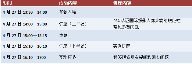 4月27日PSA China邓大端主席国际大赛专题讲座报名时间:2014年4月22日 来源:本站原创 为了帮助更多中国摄影人走向世界,促进PSA China影友积极参与PSA认证国际摄影赛事,帮助大家对PSA认证国际摄影赛事的组别定义、参赛规则有一个更清晰的认识和了解,尽量避免和减少在投稿参赛过程中发生的违规问题,提升中国摄影人参加国际赛事的入围、获奖率。我们特别邀请美国摄影学会(PSA)中国首席国际代表、PSA China主席邓大端先生为大家进行一场专题讲座。 讲座将采用“北京现场面授+网络直播”的方式,现场讲座将在PSA China总部北京进行。当天无法赴现场的朋友可以进入“PSA China网络直播教室”观看讲座直播(网络直播Q群169469468)。 现招募北京现场讲座观众60名(名额有限,报满即止)及全国网上视频直播听众(群满即止)。学习机会非常难得!欢迎报名参加! 一、讲座时间:4月27日(星期日)下午 14:00——17:00 二、讲座方式:北京总部现场面授+网络视频全国直播 三、现场地点:PSA China总部(北京,泛利大厦11层会议室) 四、主讲人: 美国摄影学会(PSA)中国首席国际代表、PSA China主席邓大端 五、讲座主题: 1、 PSA认证国际摄影大赛的参赛投稿规范; 2、参加PSA认证国际摄影大赛的常见问题与投稿技巧; 3、第五届PSAChina国际摄影大赛获奖作品赏析与讲评; 六、讲座安排 七、报名方式: 电话报名:010-85657385 邮件报名:编辑 “报名现场讲座+姓名+手机号码”发送至service@psachina.org即可参加本次活动。 短信报名:编辑短信“JZ+姓名”发送至15801122825即可报名 温馨提示: 1、为了保证参与活动的影友能够充分与老师交流学习,本次活动仅提供60个现场参与的名额,名额有限,报满即止。活动当天,请提前半小时入场。 2、观看网络直播讲座,请提前申请加入本次活动专用QQ群(PSA China大课堂):169469468,非群成员无法观看网络讲座; 八、交通提示: 现场讲座地址:北京市朝阳区朝阳门外大街 泛利大厦11层会议室 1、地铁:乘坐地铁二号线朝阳门站(A出口)下车,沿朝阳门外大街东行450米至朝外市场街,向南40米,路西即到。 2、公交车:乘坐75路、101电、109电、110路、112电、420路、 619路、750路朝外大街站下车东行50米至朝外市场街,向南40米,路西即到。 3、自驾车:起点——朝阳门外大街——朝外市场街——泛利大厦(悠唐广场北侧)