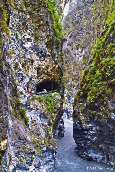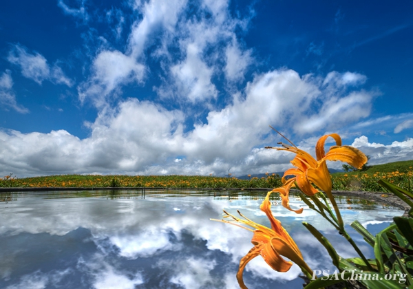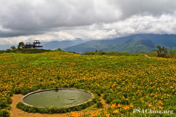 万毅和台湾嘉宾 邓大端先生和台湾陈鼎鑫先生 三、花莲遐思 大自然给了花莲县特别的眷顾。世界上独一无二的大理石岩层的大峡谷——太鲁阁国家公园;紧连太平洋的湛蓝绵长的东海岸线,紅赫冷峻的峭壁岩石;六十石山气势磅礴的金针花海。即便是摄影者,这里也是一定要踏足的地方。 读六十石(音shí)山也好,六十石(音dàn)山也对。这山名各有自己的来头。传说,原本这山到处被樟树覆盖,为了炼制樟脑,有先民大肆砍伐樟树,最后,裸露出60块巨大的石头,由此,就叫六十石(音shí)山了。 另一说则是在日本统治时期,此山周围的农田种植稻米,每亩最高的产量也不过40——50石(音dàn)左右,唯独这片山地,产量达到60石(音dàn)。石(音dàn)既是容量单位也是是重量单位,10斗为一石(音dàn),120市斤为一石(音dàn)。其实古时在用到容量、重量单位时,也读shí,所以怎么念这山名,都是对的。 六十石山的最高海拔964米,总面积约300多公顷。茶园和金针花园布满山谷。每年八、九月间,金针花盛开,站在峰顶的忘忧亭上,整个花海一览无余。山风吹来,散尽一身的暑气,格外凉爽。这山里的金针花都是农民们自1959年以后种植的。 我们去的那天8月18日,漫天大雾。登上山顶,置身在一片雾海之中。薄纱般的云雾在眼前飘来荡去,抚弄着山间的一草一木,一花一叶。远望不过十几米已是白茫茫的。临近中午,云开雾散,白云的阴影开始在山间狂奔,色彩恢复了靓丽的本色。花农、茶农劳动的身影随处可见,无需设计、无需导演就已是一幅带有沙龙韵味漂亮的图画了。 半山腰的山凹处,有一人工修葺的圆形蓄水池,它的生产功能尚未考证,但对于在台湾参加各种摄影培训班的学员来说,这里是上交摄影作业必来之地,主要的摄影实践主题就是金针花山在水池中的倒影。我们也来到这摄影习作之地。 陈金成先生、潘金明先生随手插了三朵金针花在小水池的边上,陈金成老师以低角度示范拍摄,画面上前后景呼应,前景花枝伸出由水池台面构成的地平线,整个画面融为一个整体,完全没有被割裂的破碎感。设计已经融入PSA China精英讲师团成员的脑海,设计已经成为摄影的一个习惯,哪怕是小景。 午间,大家在山间的一所茶寮歇息。邓大端主席跟刘育麟副秘书长聊起沙龙摄影的话题。六十石山可以植入更多的沙龙摄影元素,设计出除劳动场景以外的更多的场景。例如,活泼欢快的场景,小朋友在花海中放风筝。刘秘书长说,小朋友可以找当地农家的孩子,风筝则由学会带来。自数码影像诞生以后,作者将自己内心的创意想法融入控制设计进拍摄、制作的全过程,使得沙龙摄影艺术在21世纪更加大放异彩。 颇有地质地貌特色的太鲁阁国家公园的大理石峡谷也是举世闻名。乘车还是徒步自由选择,任意搭配。这里是贯穿台湾岛东西向的中横公路中非常险峻的一段。整条道路开凿在大理石岩层的断崖上,完全可以想见,在上世纪五、六十年代筑路人的艰难和危险。说起这中横公路还是在蒋经国时代,动员了上万名国民党退伍军人花了整整十年的时间才完成的。走在这条路上,很自然会联想到在太行山深处的郭亮村的挂壁公路。