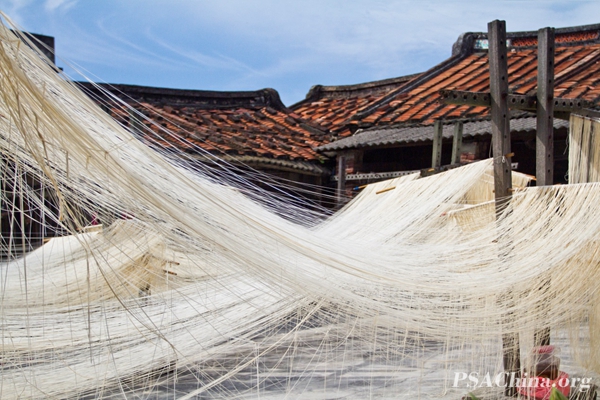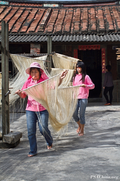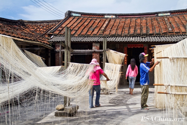 四、探访鹿港老街两主席再议大计 台湾行的最后一站是彰化县鹿港和员林小镇。后者是江村雄先生工作生活的地方。 来到鹿港的第一站是刘育麟副秘书长带我们去拍晒面线。小弄堂的尽头一家紧凑的四方院落。我们到时,院子里已经晒满了细细的面线。主人家对来摄影的游人已经司空见惯,刘育麟介绍说,他们不会阻止和反感游客们照相,只是不要妨碍他们工作。如果想要他们配合做些动作或摆POSE,最好等到他们干活快结束的时候。这里似乎是三口之家,正屋廊前的阴凉地是妈妈抻面线的地方,女儿帮着妈妈把抻好的面线抬到院子里,放在挂架上,爸爸负责收已经晾干的面线。这面线的韧性真令人叫绝。其实晒面线的手工活在很早以前就已经被机器取代了,现在仅留下几户还坚持着手工晒面线。走在台湾街巷里的时候,总会看到有一种味道叫“古早味”,这面线也是“古早味”吧。总是有坚持的人,才有坚守的味道。 自乾隆盛世,鹿港与福建泉州通商设立了官方口岸,成为台湾中部的重镇之一。香火旺盛的天后宫一直保持着台湾第一妈祖庙的地位。江村雄先生特意从员林赶来与邓大端主席和王莉副主席会面。老朋友相见自然有说不完的话。 左起:江村雄先生、邓大端先生和王莉女士 说起坚持,江村雄先生的坚持在国际摄影界可谓屈指可数。50多年的摄影生涯,对沙龙摄影情有独钟,直到现在依然坚持摄影创作,坚持参加几乎所有PSA认证的国际赛事,坚持培训学员,坚持宣传摄影创作设计的理念。最令人敬佩的是,他娴熟使用Photoshop的水平,数码影像后期再创作的艺术水平,令许多晚辈都自叹弗如。在江村雄先生的工作室里,那整整一面墙上插着12,000多张卡片,这些卡片是他参加国际沙龙摄影赛事获奖的通知信函。 左起:邓大端先生、江村雄先生、王莉女士在江村雄先生获奖证书墙前合影 在另一房间,整齐摆放和陈列着江村雄先生在国际摄影赛事中获得的部分奖杯、奖状和绶带。在这里他把准备好的《中华一家亲》的集邮册送给邓大端先生。 邓大端主席的坚持和韧性也十分令人敬佩。自从他倡立美国摄影学会(中国)PSA China以来,就一直鼓励和推动国内的摄影人走出国门,融入世界摄影的舞台。每到一地,他都不厌其烦地宣传PSA的摄影理念,向国人推介PSA的认证比赛规则。已经得到越来越多的摄影人和摄影机构的认同。不过他不会止步于此,“我们学会了遵守国际摄影比赛规则,我们的创意水平和摄影技艺不输于任何人,我们也可以玩出我们的特色,在这个过程中,我们相互借鉴,相互融合,这才是摄影语境下最好的发展方向。” 欢迎转载,请注明出处!