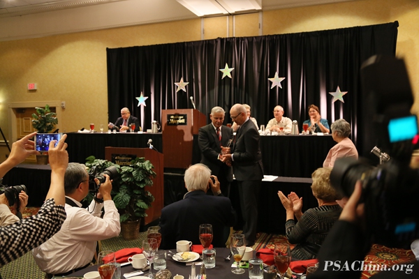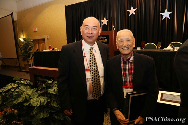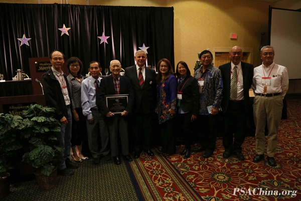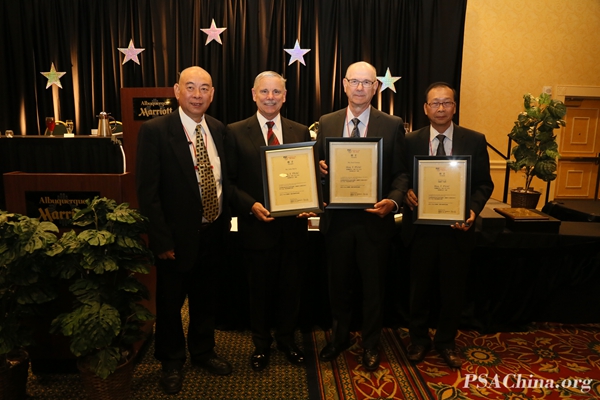 2014年10月3日,美国摄影学会第76届年会暨美国摄影学会成立80周年大会在美国新墨西哥州阿尔伯克基万豪酒店举办。来自全球各个国家的PSA地区代表和会员们齐聚一堂欢度这一年一度的盛大晚会,老友见面,场面其乐融融。 周年大会上,PSA China主席邓大端先生代表中国团队特别为PSA前任会长Mr. Fred Greene、现任会长Mr. John Davis、前副会长吴振亨先生颁发了“荣誉博学会士”奖牌,以此感谢三位PSA的元老对PSA China长期以来的支持和鼓励,帮助PSA China在短短5年间带领了大批中国人参加国际赛事,且在诸多PSA认证的国际赛事中取得了优异成绩,最后代表了PSA China团队向三位权威摄影前辈致以深深的敬意。 PSA China主席邓大端先生为PSA前任会长Mr. Fred Greene、现任会长Mr. John Davis、前副会长吴振亨先生颁发“荣誉博学会士”奖牌