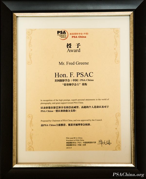 颁发给PSA上届会长、著名摄影家Mr. Fred Greene先生PSAC“荣誉博学会士”奖牌