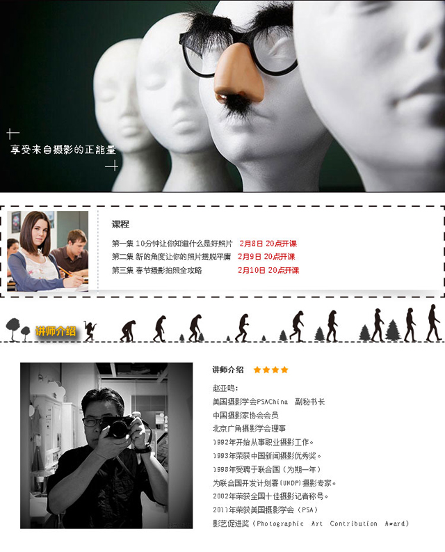 今晚(2月10日20:00)现场直播-赵亚鸣:春节摄影拍照全攻略时间:2015年2月10日 来源:本站原创 赵亚鸣老师直播课堂:春节摄影拍照全攻略 价格:免费 首播时间:2月8日20:00;2月9日20:00;2月10日20:00 课程长度:1课时 请在淘宝同学:http://xue.taobao.com/,搜索“赵亚鸣”收看! http://i.xue.taobao.com/detail.htm?spm=a2174.7365761.39b9.13.6J5swc&courseId=26756