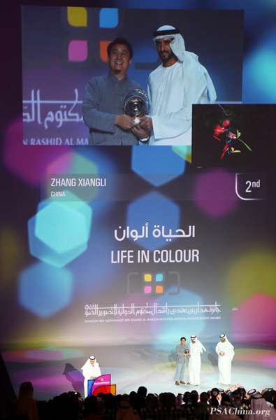 李鹏荣获《2014年第四届迪拜哈姆丹国际摄影大赛》夜景组第一名时间:2015年3月18日 来源:PSA China 2015年3月16日晚,《2014年第四届迪拜哈姆丹国际摄影大赛》在迪拜国际金融中心揭晓。来自中国的摄影师共获得3个单项奖,PSA China精英讲师团成员,中国大连摄影师李鹏凭借《湖南吊脚楼夜景》夺得夜景组第一名,奖金15,000美元;PSA China会员,江西摄影师张项理拍摄的《鸟类动态图》获生活色彩组第二名,奖金20,000美元;香港摄影师张志雄的一幅反映藏族妇女过年欢乐场景的作品《分享》获黑白人像类第三名,奖金10,000美元。 本届大赛共产生22个奖项,总奖金高达40万美元,其中特等奖奖金为12万美元,被印度摄影师安拉格•库玛尔夺得。主办方邀请了获奖者赴阿联酋出席颁奖典礼,并进行为期一周的参观采风。 本届大赛共分为四组:色彩中的生活组;自由开放组;面孔组;夜景/夜间摄影组。大赛吸引了来自166个国家和地区的3万多名参赛者,参赛作品超过6万幅。 李鹏手捧奖杯站在自己拍摄的作品前 张项理(右三)上台领奖 张志雄(右三)上台领奖 李鹏夜景组第一名作品《湖南吊脚楼夜景》 Hamdan bin Mohammed bin Rashid Al Maktoum International Photography Award (HIPA)(哈姆丹国际摄影大赛)由迪拜王储Hamdan bin Mohammed bin Rashid Al Maktoum(哈姆丹•本•穆罕默德•本•拉希德•阿勒马克图姆)发起于2011年,以其名字命名并得到其大力赞助,现已迅速成为国际知名的摄影大赛之一。赛事的创立表明迪拜对艺术、文化和创新贡献的鼓励和支持。 欢迎转载,请注明出处!