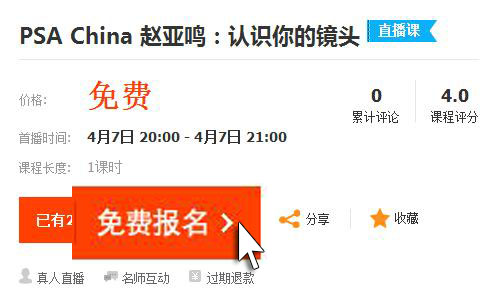 4月7日 20:00 《认识你的镜头》课堂 火热招募!数码时代,单反相机逐渐普及,谈到单反就离不开镜头,不同品牌的单反适用的镜头也不同;即使是同一品牌的镜头,也分不同的系列;不同系列的镜头又用一大堆的文字、符号、数字来表示其镜头特色。 面对复杂的镜头群,你是否会感到迷茫呢?究竟这些镜头是用来做什么的,怎样才能将自己的镜头发挥到极致?为了让大家能清楚了解各品牌的镜头,PSA China将会为大家带来一堂专门讲解单反镜头的课程。 让您在享受摄影乐趣的同时,认识并利用自己的器材,拍出更多更好地作品! 【课程时间】:4月7日20:00-4月7日21:00 主讲老师: 观看直播方式(淘宝同学): 淘宝同学直播地址(免费):http://i.xue.taobao.com/detail.htm?spm=a2174.7365737.31a9.6.wJHNhF&courseId=28977&qq-pf-to=pcqq.c2c 进入网址,登录淘宝帐号,点击免费报名! 报名成功,等待直播日期,进入网站点击观看即可。 欢迎转载,请注明出处! |