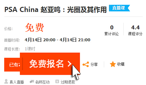 4月14日 20:00 《光圈及其作用》直播课堂 火热招募!时间:2015年4月9日 什么是光圈?它的作用是什么?画面的景深与光圈有关系吗?为什么在靠近被摄体拍摄时,即使使用小光圈,背景仍很虚化,为什么拍摄大场面的风光时,即使使用大光圈,拍出来的背景仍很清晰呢?画面的明暗与光圈又是什么关系?为什么改变光圈就可以改变画面明暗? 为了让大家能清楚了解什么是光圈及其作用,PSA China将会为大家带来一堂专门讲解光圈的课程。 【课程时间】:4月14日20:00-21:00 主讲老师: 观看直播方式(淘宝同学):http://i.xue.taobao.com/detail.htm?spm=a2174.7365761.39b9.19.G81HZi&courseId=29223