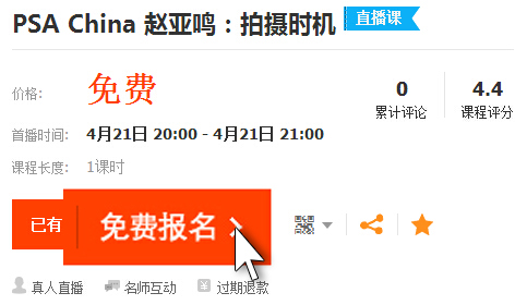 4月21日 20:00《拍摄时机》课堂,火热招募!时间:2015年4月15日 来源:本站原创 按动快门按钮是拍摄一张照片最关键的步骤。著名摄影师布列松曾提出"决定性瞬间",即是指在摄影师按快门的一刹那,把一些经典的、不可重复的因素恰如其分地收进画幅的最佳位置。这个“决定性瞬间”应该是可遇不可求的。 一张照片可能由于技术欠妥而遭到批评,但只要题材好,表现手法富于想象力,时间的选择适当,这张照片就不会失败。 因此,“拍摄的时机”对摄影师来说非常重要。为了让大家更好地把握拍摄时机,PSA China将会为大家带来一堂教您如何把握拍摄时机的课程。 按 PSA China总部的要求,各工作站、基地須组织会员集中收看网络视频和在线互动。 课程精彩,机会难得,请会员及影友们积极参加! 观看直播方式(淘宝同学): 淘宝同学直播地址(免费): http://i.xue.taobao.com/detail.htm?spm=a2174.7365737.31a9.6.DvEK7z&courseId=29502&qq-pf-to=pcqq.c2c 进入网址,登录淘宝帐号,点击免费报名! 报名成功,等待直播日期,进入网站点击观看即可。 欢迎转载,请注明出处! |