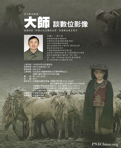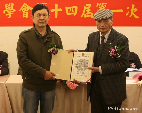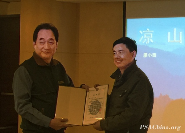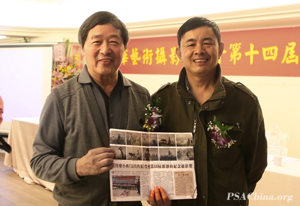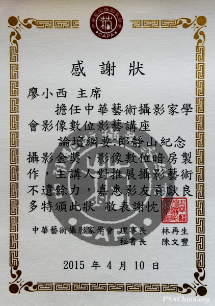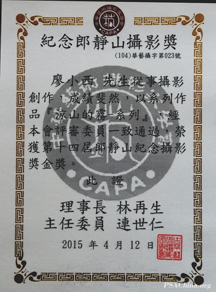 PSA China副主席廖小西赴台北领取“郎静山摄影奖”颁奖报道时间:2015年4月20日 来源:PSA China 成都工作站 雨中的台北101大厦 廖小西作品 2015年4月12日下午3点,第14届纪念郎静山大师金奖颁奖仪式在台北市长安会议大厅开幕,来自台湾各市、县的摄影家300余人出席大会,台湾中华艺术摄影家协会理事长林再生先生主持大会并介绍评审情况:本届大赛由台湾资深摄影家,台湾各大学的著名摄影教授和中国大陆的摄影名家参与评审,保证了评选结果更为公平、公正,本次大赛唯一金奖授予美国摄影学会(中国)副主席廖小西先生。 台湾中华艺术摄影家协会荣誉理事长周鑫泉先生向廖小西先生颁发金奖证书和奖金 与台湾中华艺术摄影家协会理事长林再生先生;新北市摄影学会荣誉理事长陈鼎鑫先生一齐点赞 台湾中华艺术摄影家协会荣誉理事长周鑫泉先生颁发郎静山大师女儿郎毓文女士赠送大师原作一张(60公分x36公分)。全场响起热烈的掌声 廖小西副主席现场发表获奖感言,感谢本次影赛授予的荣誉,并转达了PSAC主席邓大端先生对参加会议的台湾摄影界朋友的问候,欢迎各位摄影家参加北京2015年第七届PSAC国际摄影大赛,与会人士多次热烈鼓掌响应。 台湾各摄影学会(组织)的负责人依次向廖小西副主席祝贺并合影留念。 与亚洲影艺联盟会长周志刚先生合影。 与世界华人摄影学会 会长翁庭华先生合影。 与中洲科技大学艺术摄影教授江村雄先生合影。 与台湾摄影学会理事长王传信先生合影。 与新北市摄影协会理事长洪如玉女士合影。 与台湾中华艺术摄影家协会副理事长黄显文先生合影。 与基隆市摄影学会名誉理事长应文进先生(右) ;台北摄影学会副理事长江哲和先生(左)合影 廖小西先生携夫人特别感谢:中华艺术摄影家协会以及新北市摄影协会、台湾摄影学会、基隆市摄影学会热情体贴的接待,同时表达了PSAC希望对与会的台湾地区各摄影学会(协会)加强进一步交流的意愿。 在台期间, 4月10日晚7点,廖小西副主席在台北市讲演厅进行了“郎静山摄影金奖创作思考和影像数码后期制作“的学术讲演,在与听众的互动中,讲演延迟到晚10.30 时结束,受到听众热烈赞誉。 廖小西先生接受林再生理事长颁发论坛讲演证书 4月14日,廖小西副主席回到成都,结束了为期6天的台湾之行。 论坛讲演证书 摄影金奖证书 金奖作品:凉山的雾-阿咪子 金奖作品:凉山的雾-回家 金奖作品:凉山的雾-赶街 金奖作品:凉山的雾-祖母