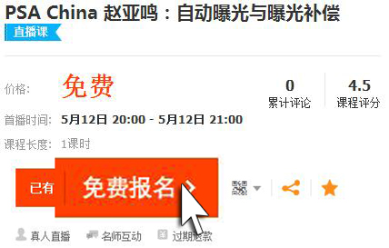 5月12日 《自动曝光与曝光补偿》大课堂!欢迎收看!时间:2015年5月6日 来源:PSA China 什么是自动曝光?什么时候要用到自动曝光?在什么情况下需要降低曝光补偿?在光圈优先模式下,为什么改变曝光补偿会导致快门速度同时改变?为什么在全手动曝光模式下,无法使用曝光补偿? 想弄清楚这些问题吗?想要更好地运用自动曝光和曝光补偿吗?敬请关注和观看PSA China为大家带来的摄影大课堂——《自动曝光与曝光补偿》。 按 PSA China总部的要求,各工作站、基地須组织会员集中收看网络视频。 课程精彩,机会难得,请会员及影友们积极参加! 观看直播方式(淘宝同学): 淘宝同学直播地址(免费): http://i.xue.taobao.com/detail.htm?spm=a2174.7365761.39b9.11.ryeok5&courseId=30224&qq-pf-to=pcqq.c2c 报名方法: