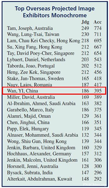 PSA世界摄影名人录,是PSA秉承公平、公正、专业性的理念,依据PSA会员在每年数百个国际摄影赛事中,参赛作品获得的入围成绩进行的综合统计。该排行榜因其权威性和专业性,被世界摄影人广泛认可。能够有3个组别均进入该排行榜前25名,足以说明万毅老师在国际影赛中的辉煌战绩。
