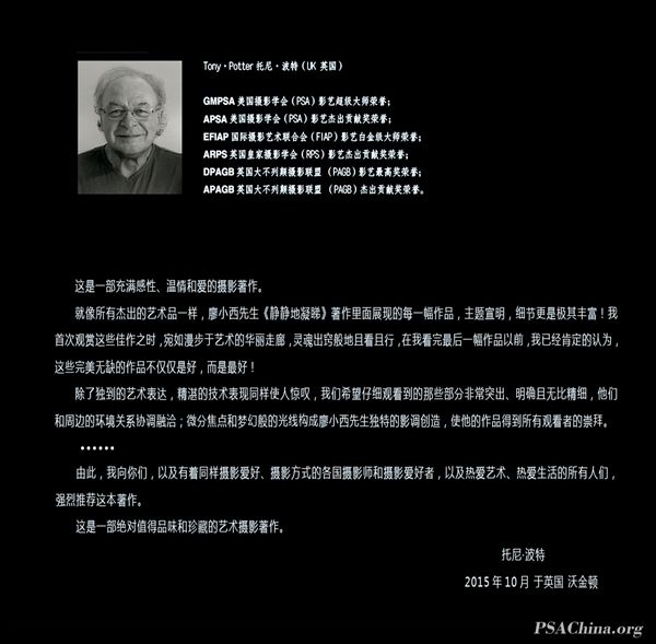 PSA China副主席廖小西国际摄影展览/作品选集《静静的凝睇2》首发时间:2015年12月30日 来源:本站原创 12月26日,艳阳高照,喜气洋洋。美国摄影学会(中国)副主席廖小西《国际金牌作品展览》暨金牌作品画册《静静地凝睇2》在成都华侨城展览馆隆重揭幕。 四川省委宣传部副部长赵明仁宣布展览开幕;四川省文联党组副书记、副主席李兵和嘉宾代表台湾中华艺术摄影家学会理事长林再生发表致辞;中国摄影家协会副主席、四川省摄影家协会主席王达军等出席开幕仪式;廖小西发表了创作感言,并对参加开幕的领导、嘉宾和观众致谢! 领导和嘉宾随后兴致勃勃参观了展览。 四川省委宣传部赵明仁副部长(右1)省文联李兵副主席(右2)在廖小西陪同下参观展览 省委宣传部赵明仁副部长兴致勃勃的观看展览作品 李兵副主席在廖小西、林再生陪同下参观展览 省文联李兵副主席(右2)中国摄影家协会副主席王达军(左1)台湾中华摄影学会主席林再生(右1)和作者廖小西 《静静地凝睇》画册首发仪式作者发表感言 签名售书人涌如潮 同场开展的还有“2015川台境界·四川台湾两地摄影家艺术展览”。两个小时的开放时间,到场参观展览和购书的摄影爱好者及观众超过3000人,展览取得圆满成功! 美国摄影学会(中国)主席邓大端发来热情洋溢的贺电,对廖小西作品给于高度赞扬:廖小西的作品其表现内容和手法既时尚又传统,堪称完美的艺术,代表了当下国际艺术摄影发展的最强音,是PSAC的艺术摄影风标!常务副主席王莉和主席团各位副主席对廖小西先生发来贺电;同时,展览还收到美国摄影学会(中国)北京总部以及广州、上海、杭州、赤峰、潍坊等工作站的贺信贺电,祝贺展览圆满成功。 廖小西国际摄影比赛金奖作品集《静静的凝睇2》当天受到热烈追捧,爱好者们争相一睹为快,爱不释手,签名售书供不应求。 首展时间10天,元旦大假特别开放,2016年元月5日结束。 随后,还将在四川各市、地、州和全国一些城市以及台北举行巡回展出。