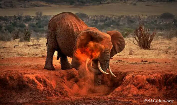 非洲炎热干旱的季节,我们来到了这个荒无人烟的保护区,一只年轻俊美的雄性大象来到几乎干涸的水塘边,它卷起红色的尘土喷洒在自己硕大的身躯上,飞溅的红沙在它的脸庞像绚丽的花朵般绽放。