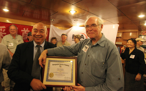 欢迎酒会进入高潮,吴振亨副会长致辞,并向与会人员介绍PSA元老会员及家人,他们大多都是具有50年以上PSA会龄的会员,并都担任或曾经担任美国摄影学会高级职务,大家聚拢在PSA会旗下。在PSA元老会员的见证下,吴振亨副会长向大家宣布任命:邓大端先生为PSA中国区首席代表。邓大端先生现任美国纽约摄影学会名誉顾问,中国青年摄影发展共同体名誉主席,广东省青年摄影家协会永远名誉主席等职。多年来,邓大端先生为建立和发展中美摄影界的交流与合作做了大量工作,为增进两国摄影界及摄影团体间的友谊不懈努力。王莉女士为PSA中国区首席代表助理、王琛先生、沈健先生和张珂女士为中国区国际代表,PSA元老级前辈们向他们一一颁发了PSA授予的证书。