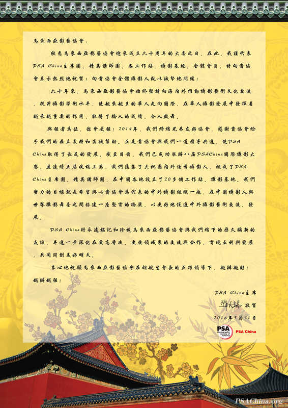 马来西亚影艺协会60华诞,PSA China主席邓大端致信祝贺时间:2016年5月31日 来源:本站原创 近日,马来西亚影艺协会(PSM)迎来成立六十周年大典。马来西亚影艺协会(简称PSM)成立于1956年,经过长期发展,已经成为马来西亚、亚洲地区乃至全世界范围内领先的摄影组织。2014年,马来西亚影艺学会与PSA China结为兄弟友好协会。会长胡航生先生被授予PSA China荣誉博学会士荣衔(Hon. FPSAC),他曾担任第五届PSA China国际摄影大赛评委,并多次来中国参加PSA China活动,与PSA China建立了深厚的友谊。值此60周年之际,PSA China主席邓大端先生致信祝贺。 附: 马来西亚影艺协会(简称:PSM)在1956年由一群非常热爱摄影的爱好者们组建,曾用名“马来西亚联邦影艺协会”。马来西亚影艺协会经过长期的发展,已经成为马来西亚、亚洲地区乃至全世界范围内领先的摄影组织。协会拥有长期并且杰出的历史,许多杰出的摄影家都是协会会员。 马来西亚影艺协会作为一个非官方组织,创立的目的旨在发展推动摄影艺术及摄影技术的进步,它也是一个提高协会会员和广大群众摄影技术的教育性组织。同时,马来西亚影艺协会也力求成为一个拉近马来西亚、亚洲乃至全世界摄影爱好者距离的平台。 马来西亚影艺协会是美国摄影学会(PSA)的团体会员成员。同时,也是国际影艺联盟(FIAP)认证的国际分支组织。