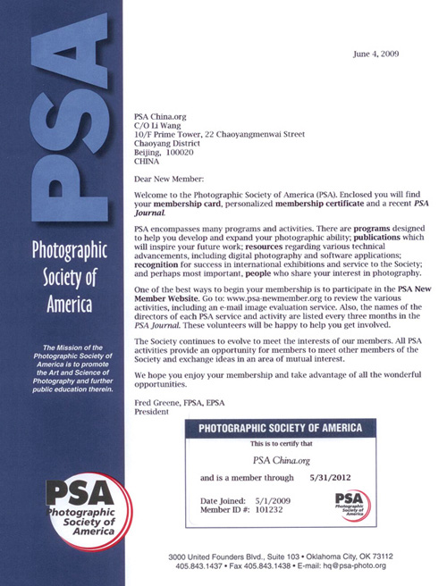 时间:2009年06月17日 来源:本站 美国摄影学会主席Fred Greene(FPSA ,EPSA 称号),颁发给PSA China.org的授权证书 新加盟美国摄影学会的会员,将收到PSA随信一起寄出的会员卡,会员证书以及最新出版的美国摄影学会会刊。 美国摄影学会为会员提供了许多课程和活动。这些课程都是为帮助美国摄影学会会员提高摄影技巧而专门设计的。为了能够对美国摄影学会会员的摄影技巧有所帮助和启发,美国摄影学会的出版物中会提供一些数码摄影的相关软件和数码摄影作品等。美国摄影学会可以在国际展览以及学会内部评定优秀的作品。另外最重要的是,会员可以在美国摄影学会与志同道合的人一起分享摄影的乐趣。 成为美国摄影学会新会员后,最简便的方法就是登录www.psa-newmember.org来查看近期内将举行的所有活动,其中包括了一个e-mail形式发给会员图像评价服务。同时,美国摄影学会各学科的负责人将在会刊中每3个月为会员刊登一次他们的近期活动和服务。这些志愿者将会很高兴的帮助会员解决所有疑问。学会将继续挖掘会员对摄影的兴趣。所有美国摄影学会的活动都是为会员提供一个相互认识,相互了解和相互学习的机会。