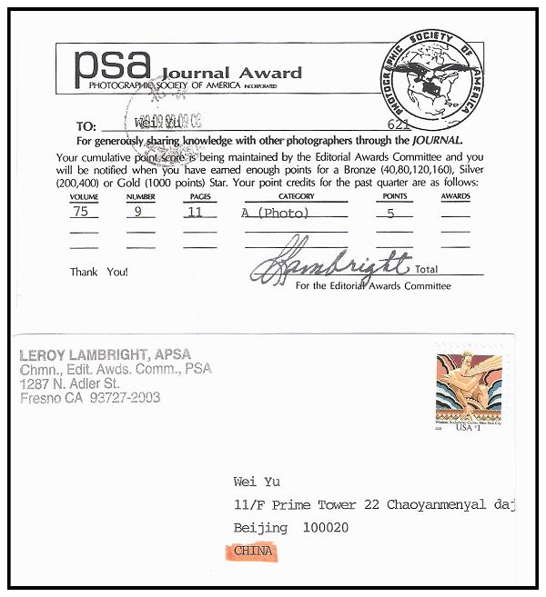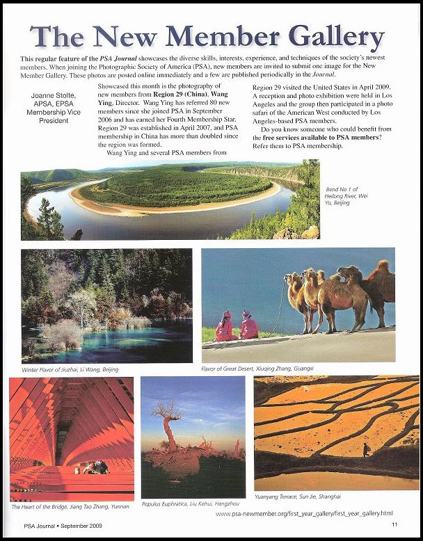 时间:2009年09月17日 来源:本站原创 每个新会员在加入美国摄影学会时,都会受邀为“新会员影廊”递交一张作品。这些照片会很快在PSA官网上发布,其中的一些优秀作品还将定期刊登在每月的会员月刊上。 令人高兴的是,在2009年9月会员月刊的“新会员影廊”里,我们看到了PSA中国区首席代表助理王莉女士、PSA中国国际代表张秀清女士以及PSA会员于蔚先生、张江涛先生等6位中国区会员的作品。这些照片题材丰富,各有千秋,向PSA以及全世界展现了我们中国摄影人的水准和风采。 作品被刊登在月刊上的新会员,都会收到一张来自PSA会员月刊的积分卡。这是由编辑部奖项委员会设立的,根据积分的积累多少,会员们可以获得金、银、铜奖牌的嘉奖。 希望各位新会员多多精选自己的作品,通过“新会员影廊”这一交流平台,把自己有关摄影的技巧、经验、乐趣同大家分享,赢取更多的荣誉和奖励,将中国摄影独有的魅力呈现给世界! PSA9月会员月刊“新会员影廊”页 于蔚先生的PSA会员月刊积分卡