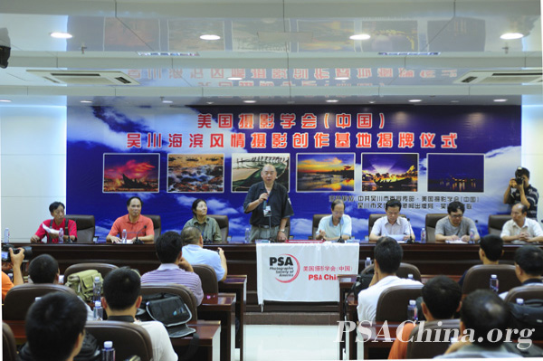 美国摄影学会(中国)吴川摄影基地揭牌时间:2010年08月04日 来源:本站原创 2010年8月1日美国摄影学会(中国)第三个摄影创作基地在广东吴川正式设立。 揭牌仪式会场(摄影:东哥哥) 吴川海滨风情摄影创作基地的设立得到了吴川政府的大力支持。出席揭牌仪式的有中共吴川市委宣传部副部长,文联主席林明栋、吴川市文化广电新闻出版局长陈燕熙、茂名市摄影家协会主席彭永强、吴川市文化广电新闻出版副局长肖康华、吴川市教育局副局长林木养和吴川市摄影协会副主席胡通、美国摄影学会中国区首席国际代表邓大端、美国摄影学会国际代表、会员部主任王莉和众多摄影家及摄影爱好者。 邓大端先生说,吴川的海岸风情独具魅力,沙龙摄影味十足,既有海滩落日的柔美,金色的典雅,诗一般的梦幻,又有大海磅礴的气势,刚毅大度。许多优秀作品都是出自这块宝地。吴川更是人杰地灵,历史文化厚重。美国摄影学会(中国)吴川摄影基地建于此,目的就是通过这个平台,让更多摄影家到这里拍摄创作,让更多优秀摄影作品问鼎世界影坛。邓大端先生代表美国摄影学会(中国)对当地和远道而来的各位影友、对美国摄影学会广州站站长黄宣钦(黄牌)老师,陈金成老师,胡通老师和茂名摄影家协会彭主席等众多摄影家的到来表示由衷地感谢。 吴川摄影基地揭牌(摄影:东哥哥) 美国摄影学会(中国)国际代表和吴川政府领导及各界摄影人士合影(摄影:东哥哥)
