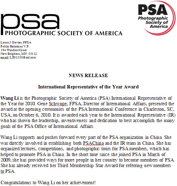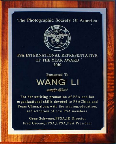PSA中国区地区主任、国际代表王莉女士荣膺2010年度国际代表大奖时间:2010年11月1日 供稿:PSA 编译:美国摄影学会(中国) 2010年10月06日,在美国摄影学会第72届国际摄影年会开幕典礼上,美国摄影学会国际事务部主任吉·斯沃普(Gene Sshwope)先生将2010年度国际代表大奖颁发给了PSA中国区地区主任、国际代表王莉女士。该奖项设立的宗旨是表彰本年度最具领导力与创造力的国际代表,同时也为表彰王莉女士很好的完成PSA国际事务委员会所指派的各项任务,为PSA做出了巨大贡献。 在王莉女士的支持和推动下,美国摄影学会(PSA)在中国的发展全面向前推进。在她的亲自领导下,美国摄影学会(中国)和中国国际代表团队得以建立。同时,她还致力于为中国会员组织内容丰富多样摄影课程、摄影竞赛、以及摄影采风活动,大大提高了美国摄影学会(PSA)在中国的影响。 自2009年3月正式加入美国摄影学会(PSA)以来,王莉女士便开始尝试通过多种不同的方式,推荐了许许多多的中国摄影人加入美国摄影学会(PSA)。仅仅过了一年多的时间,她现在已经获得了第三颗会员之星奖(The Membership Star)! 在此,让我们衷心祝贺王莉女士所获得的成就~! 本文编译自PSA公共关系副主席劳·戴维斯先生(Laura Davies, FPSA)所提供的官方新闻稿。
