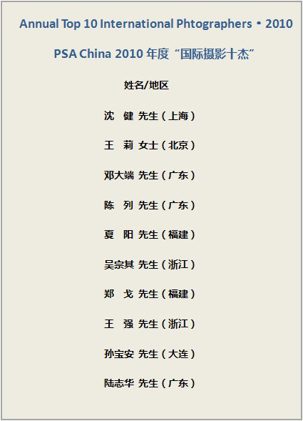 根据PSA中国会员在2010年度参加各项PSA认证国际赛事的获奖成绩和对PSA中国区工作具有突出贡献的会员,综合评选出了10位会员获得2010年度“国际摄影十杰”称号!各项成绩在美国摄影学会(中国)永久记录。