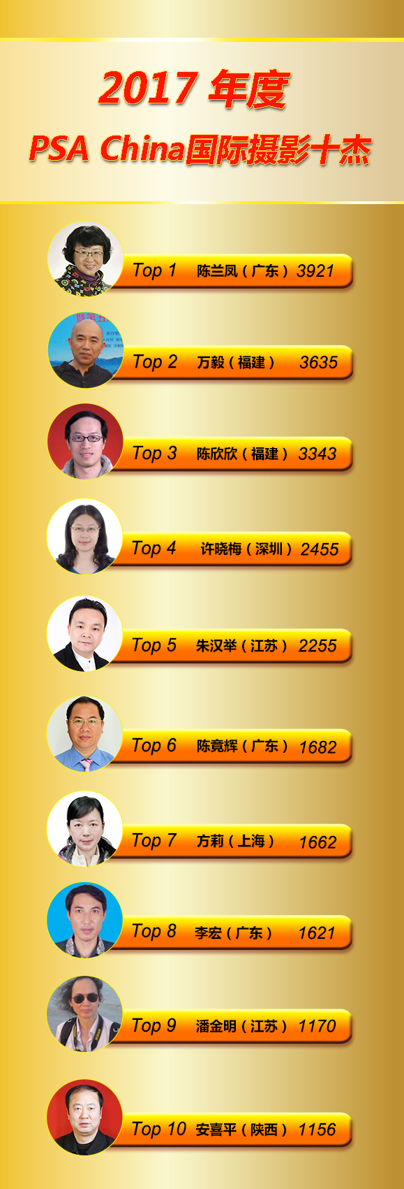 2017年度“PSA China国际摄影十杰”揭晓!时间:2018年03月12日 来源:PSA China PSA China是中国摄影人走向世界摄影舞台的桥梁。为广大会员、影友提供国际摄影赛事代理参赛服务。2017年,共有2000余人次在PSA China的帮助下,参加了295项国际摄影赛事。其他也有众多PSA China会员和中国影友,在其他代理组织或自身的努力下,凭借高超的摄影技能和非凡的艺术造诣,使得中国摄影人在国际摄影赛事领域捷报频传。 根据PSA China的综合统计,在全面公开发布赛事详细成绩的332个PSA认证赛事中,2017年大中华区摄影人共获得入围超过16万幅次,其中有超10000幅次作品获得了各类奖项,PSA China也在多项国际摄影大赛中获得团体奖、最佳俱乐部奖等奖项。 2009年,PSA China将PSA认证国际赛事引入中国,并率先组织中国摄影人参加国际认证赛事,越来越多的中国摄影人凭借自己的精湛影艺在国际影坛摘金夺银。PSA China鼓励会员与影友以各种方式,独立或通过各种规范的摄影组织参加PSA认证国际赛事。 在取得傲人成绩的同时,部分摄影人及其作品由于对PSA赛事规则的不熟悉,或代理机构疏于职守,出现了一些违规现象,甚至被列入PSA赛事黑名单。 为了保障广大中国摄影人更好地通过参赛学习提高,提升影艺,摘金夺银,PSA China提醒广大摄影人在参赛过程中,遵守PSA组别定义,遵守各PSA认证赛事参赛规则。特别需要指出的是,严格遵守PSA国际认证赛事的基本道德准则: 1、参赛者的作品整体及其中元素是参赛者自己完成的(包括后期); 2、参赛者自主决策参赛作品; 3、保持个人参赛名一致性; 4、同一作品不能有多个名字,彩色与黑白版本应该有不同的名字; 5、作品在一个赛事入围后,同一作品及其相似作品不能再参加同一系列赛事的相同星标组别。 2018年,PSA China将继续代理中国摄影人参加国际摄影赛事,协助已经取得傲人成绩的中国摄影人申请PSA星标名衔,为继续推动中国摄影人走向国际搭桥铺路!