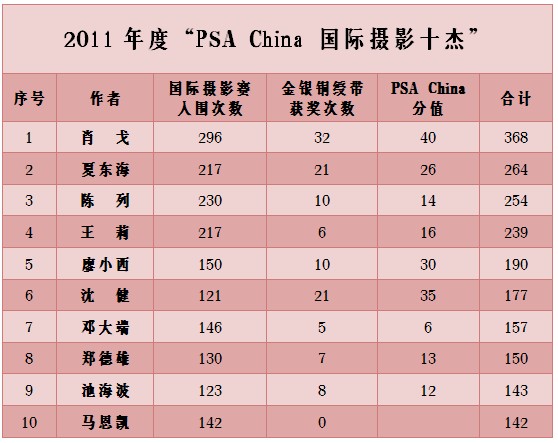 2011年度“PSA China国际摄影十杰”时间:2012年03月23日 来源:本会秘书处 “只要你热爱摄影,你就属于PSA!” 美国摄影学会(中国)(PSA China)根据本会会员在2011年参加美国摄影学会(PSA)认证的诸多国际摄影大赛所公布的获得入围以上奖的成绩数据,根据入围次数、获得入围以上奖的次数和PSA China的评分规则,将这三项分数汇总,并由高到低进行排序,产生了2011年 PSA China 的“国际摄影十杰”。2011年,在美国摄影学会(中国)(PSA China)的大力推动下,中国参赛者正在成为世界各地国际摄影赛事的新生力量,本年度评选出的这十位PSA China的会员更是这一批新生力量中的佼佼者。与2010年度相比,参赛者的入围获奖作品无论在数量还是质量上均有显著提高,充分体现出会员热爱摄影、勤奋执着、持之以恒、追求卓越的精神! 每年度,美国摄影学会(中国)(PSA China)都会根据PSA China的会员在本年度参加各项PSA认证的国际赛事的中获奖成绩评选出PSA China年度“国际摄影十杰”,其各项成绩在美国摄影学会(中国)(PSA China)永久记录。 PSA China 的评分规则是以美国摄影学会(PSA)国际影展的奖牌系列为标准,同时为鼓励会员在多多参加国际摄影大赛的基础上,更努力地提高自己的摄影技艺,去摘取国际比赛最高的奖牌。例如:陈列先生的64幅摄影作品在2011年获得入围230次、获得入围以上奖10次,其中获得PSA 铜奖1次、PSA绶带奖2次,其他绶带奖、优异奖等7次,因而另外根据PSA China 的评分规则,在他总成绩240分的基础上,另外获得PSA China 14分,总分值为254分,位列2011年“ PSA China国际摄影十杰”第三。 我们为中国摄影家走向世界搭桥铺路,希望更多的摄影家加入我们的团队,希望更多的中国摄影人在国际摄影赛事中取得骄人的成绩。