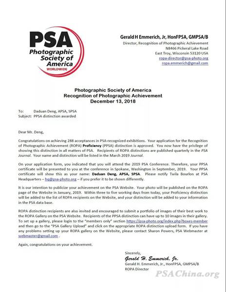 卓越成就于一身!祝贺PSAC主席邓大端被授予PPSA(影艺精通会士)名衔时间:2018年12月17日 来源:本站原创 “如果说每一次国际赛事成功入围就像一颗璀璨的珍珠,那么PSA星标、名衔体系就是串起颗颗珍珠的项链!” 近日, PSA China主席邓大端成功申请并被PSA授予美国摄影学会PPSA(影艺精通会士)名衔。至此,邓大端主席成为中国唯一一位集美国摄影学会三大名衔于一身的卓越摄影人。 2014年10月邓大端主席在PSA周年大会上一人独获红宝石奖等4大奖牌。 2017年9月,在美国匹茨堡年会上,邓大端主席成为中国第一位荣获APSA名衔的摄影人。 2018年1月,邓大端主席获批组照考级名衔SPSA。 2018年10月,邓大端主席获批PPSA(影艺精通会士)名衔。 APSA、SPSA和PPSA是美国摄影学会(PSA)在不同领域和面向的不同名衔体系,全面荣获三大名衔,代表PSA对邓大端主席摄影艺术造诣的高度认可之外,也标志着邓大端主席多年来在中国摄影艺术发展,以及将PSA理念引入并在中国发扬光大的不懈努力,得到了世界的充分肯定! 邓大端主席为将美国摄影学会引进中国,让中国摄影人走向世界而孜孜不倦地努力着,一批批优秀摄影家均是通过PSA China选送作品参加国际摄影赛事而取得国际摄影至高荣誉。在邓大端先生的组织下,PSA China已成功举办了十二届PSA认证的国际摄影大赛,现在第十三届PSA China国际摄影大赛正在火热征稿! 邓大端主席说:“推动越来越多的中国摄影人走向世界,站到国际摄影舞台上,领取越来越多、越来越高的奖项,是我的目标!PSA China的责任从始至终就是一座“桥梁”,而我甘愿做一颗铺路石,只要有热爱摄影的朋友,我们就甘心为你铺路!大家站地越高,走地越远,取得的成功越大,我们越自豪!PSA China希望带领更多的中国摄影人了解世界,让更多的世界摄影人了解中国!” 作为中国首个PSA团体会员组织,PSA China一直以来以成为广大摄影爱好者的大家庭为目标,以推动中外摄影人交流为手段,以成为中国摄影人走向世界的桥梁为己任,通过帮助广大摄影人参加PSA认证国际摄影赛事,举办PSAChina国际摄影大赛,宣传PSA理念,带动广大中国摄影人走上世界摄影舞台!邓大端主席获颁的荣誉,表明中国摄影人走向世界的成绩正在获得世界各国摄影人的认可! 欢迎转载,请注明出处! |