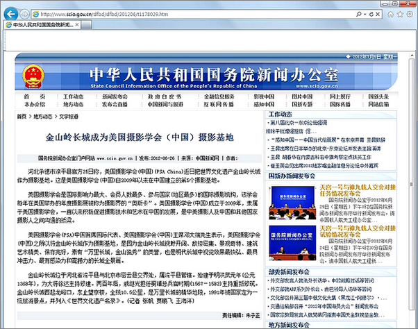 重要信息导读时间:2012年07月10日来源:本站原创 “美国摄影学会(中国)(PSA China)在金山岭长城建立摄影基地”被中国新闻网、国务院新闻办公室门户网站、搜狐网等数十家网站刊发和转载,这从一个侧面反映了美国摄影学会(中国)(PSA China)自2009年成立以来得到了越来越多的人的关注;美国摄影学会(中国)(PSA China)努力认真的工作得到了越来越多人的认可;美国摄影学会(中国)(PSA China)所倡导和坚持的中外摄影文化交流的理念得到了越来越多的人的共识。在这里,我们将国务院新闻办公室门户网站(http://www.scio.gov.cn)转发的《金山岭长城成为美国摄影学会(中国)摄影基地》一文贴图如下,以飨读者。 (原文链接:http://www.scio.gov.cn/dfbd/dfbd/201206/t1178029.htm)