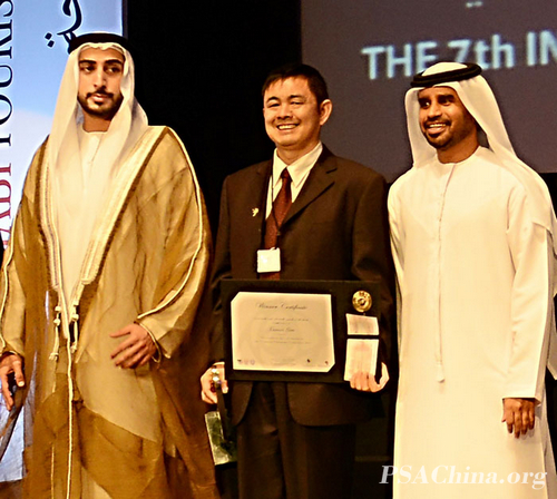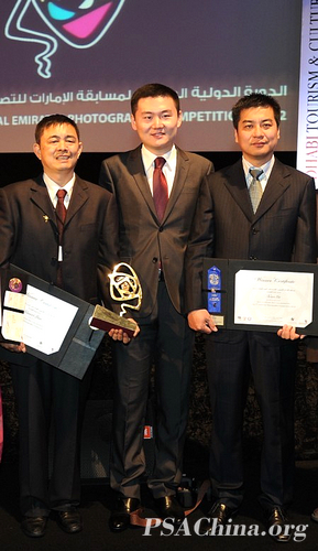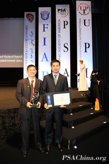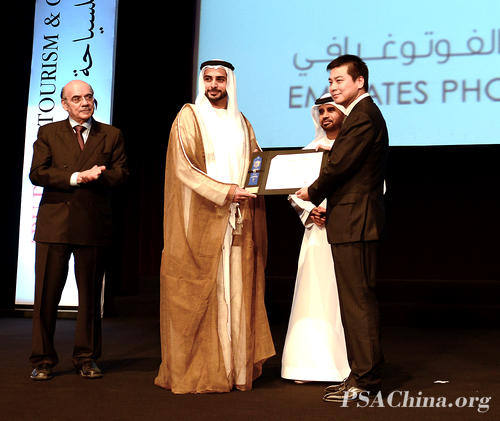 PSA China会员荣获阿联酋第七届国际摄影展览两项最高大奖时间:2012年12月26日 来源:本站编辑 PSA China会员廖小西先生(左)和肖戈先生(右) 2012年12月18日晚,第七届阿联酋摄影展览颁奖礼在阿拉伯联合酋长国首都阿布扎比国际展览中心国家剧院隆重举行。来自中国的两位优秀摄影家、美国摄影学会(中国)(PSA China)会员——廖小西先生、肖戈先生,双双荣获本届摄影大赛最高奖项。在此,美国摄影学会(中国)向两位会员表示热烈祝贺! 第七届阿联酋摄影展览开幕仪式当地时间晚上八点正式开始,现场揭晓获奖作品并颁发奖项,来自世界各国的获奖者作为特邀嘉宾,等待着自己的欣喜。最终,摄影家肖戈凭借在来自全球130多个国家和地区的摄影师共计20000余幅参赛作品中总分排名第一,荣膺本届大赛最佳摄影师奖,以表彰他在摄影方面取得的杰出成就。悬念的最后,中国摄影家廖小西登台,其艺术作品《村口的球赛》获得阿拉伯联合酋长国最高奖和国际摄影艺术联合会(FIAP)金牌。在全场热烈掌声中,阿联酋皇室贵宾亲自为他们颁发了奖杯、奖牌、证书和奖金,并合影留念。 廖小西作品:《村口的球赛》 肖戈作品:《拼斗》 廖小西:“这是我在国际艺术摄影展览中的第30个金奖,也是中国人的骄傲。很高兴和我的朋友共享”。 中国驻阿联酋大使馆的代表也转呈到现场向廖小西先生、肖戈先生表示热烈祝贺。 颁奖典礼结束后,本届国际摄影展览作品正式对观众开放。本届国际摄影展经过美国摄影学会(PSA),国际影艺联盟(FIAP),国际摄影师联盟(UPI),阿布扎比文化遗产局(ADACH)等摄影权威机构认证,分为特别主题(文化思考组)和一般主题,其中一般主题包括自然组、肖像组、运动组、微距摄影组以及未来图像组。 美国摄影学会(中国)(PSA China)也在此向廖小西先生、肖戈先生表示衷心地祝贺。并在他们来北京担任“第三届主题国际摄影大赛”评委期间,专门举办了一场庆功会。 皇室代表亲自为廖小西颁奖 皇室代表亲自为肖戈颁奖 廖小西(左)、肖戈(右)与中国驻阿联酋大使馆代表 PSA China主席邓大端与廖小西共举奖牌合影 庆功会上合影