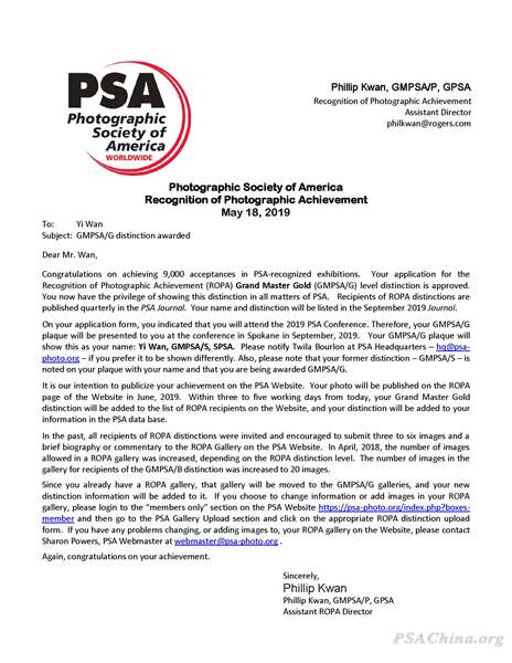 【祝贺】万毅被美国摄影学会授予GMPSA/G(影艺超级大师/金质)名衔时间:2019年5月29日 来源:本站原创 “如果说每一次国际摄影赛事成功入围就像一颗璀璨的珍珠,那么PSA星标、名衔体系就是串起颗颗珍珠的项链!” 近日, PSA China 精英讲师万毅老师用超过2000张作品9000次以上的入围成绩,成功申请并被美国摄影学会(PSA)授予GMPSA/G(影艺超级大师/金质)名衔,他是中国大陆至今首位获得此名衔的摄影人。在此,表示热烈的祝贺!