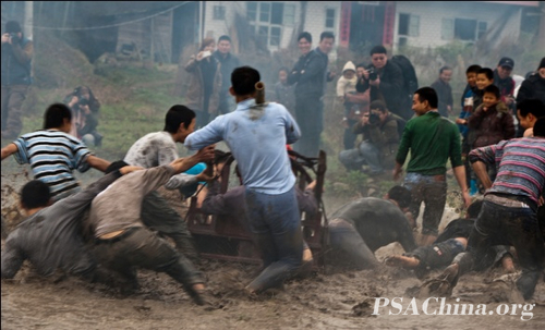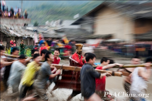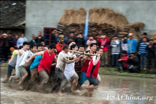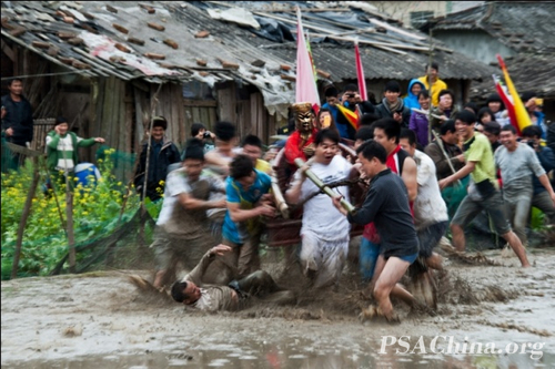 据村里的老人说,村民们每年都会在这个时侯将关公抬到泥田里玩耍,一是祭关公,祈求来年风调雨顺、五谷丰登;二是:以这种比拼体力的活动来闹元宵,增进村民间的感情。几个轮回过后,大家的体力都消耗了不少,但真正的高潮才刚开始,轿夫们不再分组,所有人一起上阵,抬着关公轿奋力向前冲、跑大圈,强大的轿夫如同公牛向前奔来。其气势势不可挡。