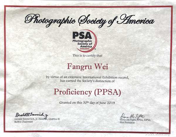【祝贺】魏仿儒被授予美国摄影学会PPSA(影艺精通会士)名衔时间:2019月9月26日 “如果说每一次国际赛事成功入围就像一颗璀璨的珍珠,那么PSA星标、名衔体系就是串起颗颗珍珠的项链!” 近日,在PSA China的帮助下,PSA China 会员魏仿儒老师成功申请并被PSA授予美国摄影学会PPSA(影艺精通会士)名衔。特此祝贺! 魏仿儒PPSA(影艺精通会士)名衔证书 美国摄影学会(PSA)自1947年起,通过星级系统对PSA会员入围成绩进行认证。凡PSA会员参加由PSA认证的国际赛事入围的作品,均可获得相应的积分并记录到“世界摄影名人录”中,通过积累一定数量的入围分数和入围作品数量,即可被授予不同的星标、荣誉名衔。 持有的PSA星标等级和荣誉名衔越高,说明在国际认证影赛中的战绩越辉煌,PSA星标、名衔体系是国际摄影界对摄影师艺术水平的重要认证,也是国际摄影人共同追求的荣誉。